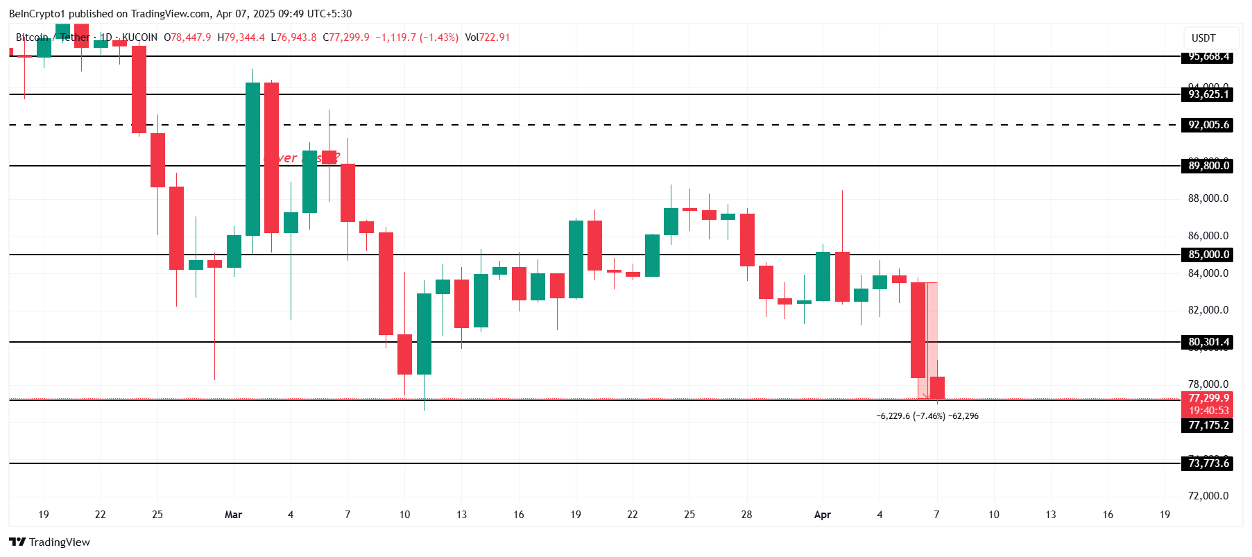 No momento, o BTC se mantém acima do suporte crítico de US$ 77.175. Caso o mercado continue enfraquecido, a criptomoeda pode cair até US$ 73.773.