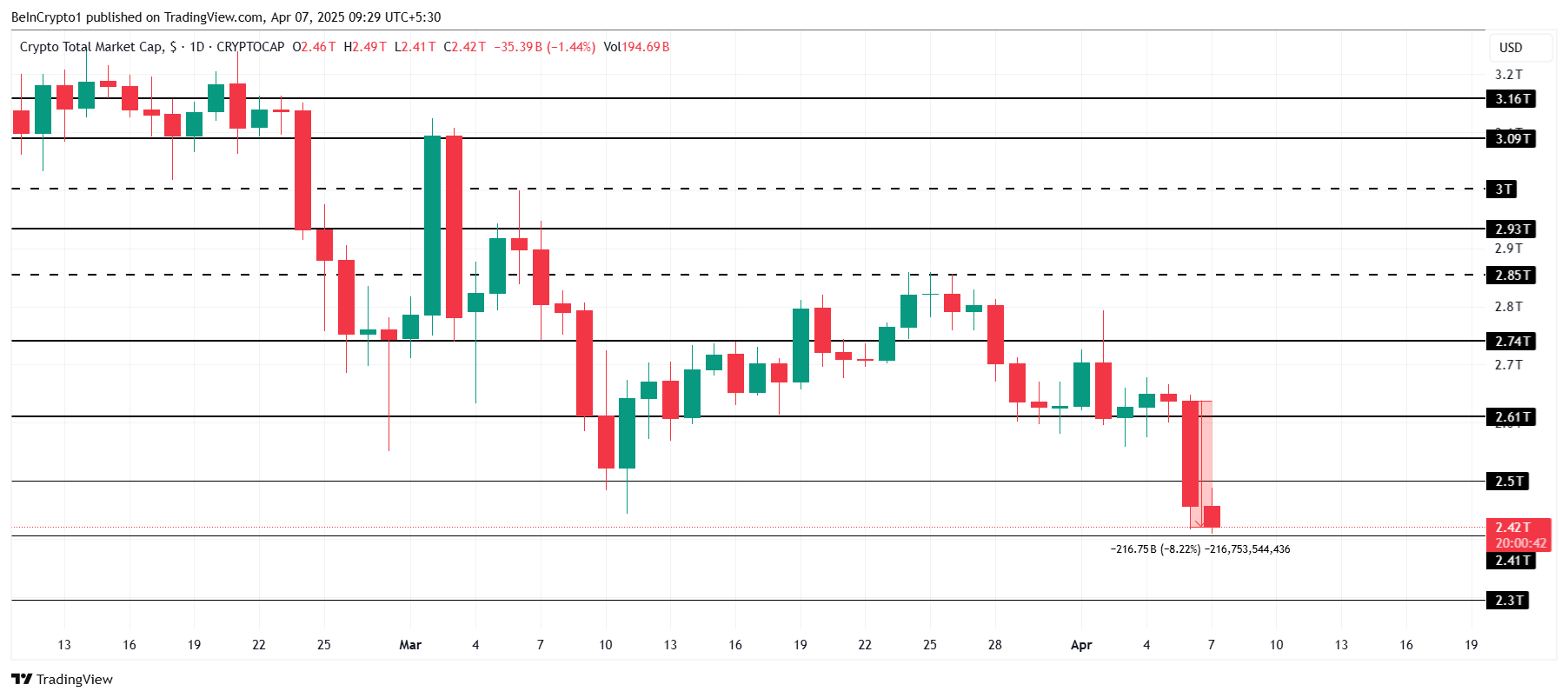 A capitalização total do mercado cripto caiu expressivos US$ 216 bilhões nas últimas 24 horas, chegando a US$ 2,42 trilhões. A queda foi causada principalmente pelas tensões comerciais desencadeadas pelas políticas do ex-presidente Donald Trump, que também afetaram os mercados acionários globais.