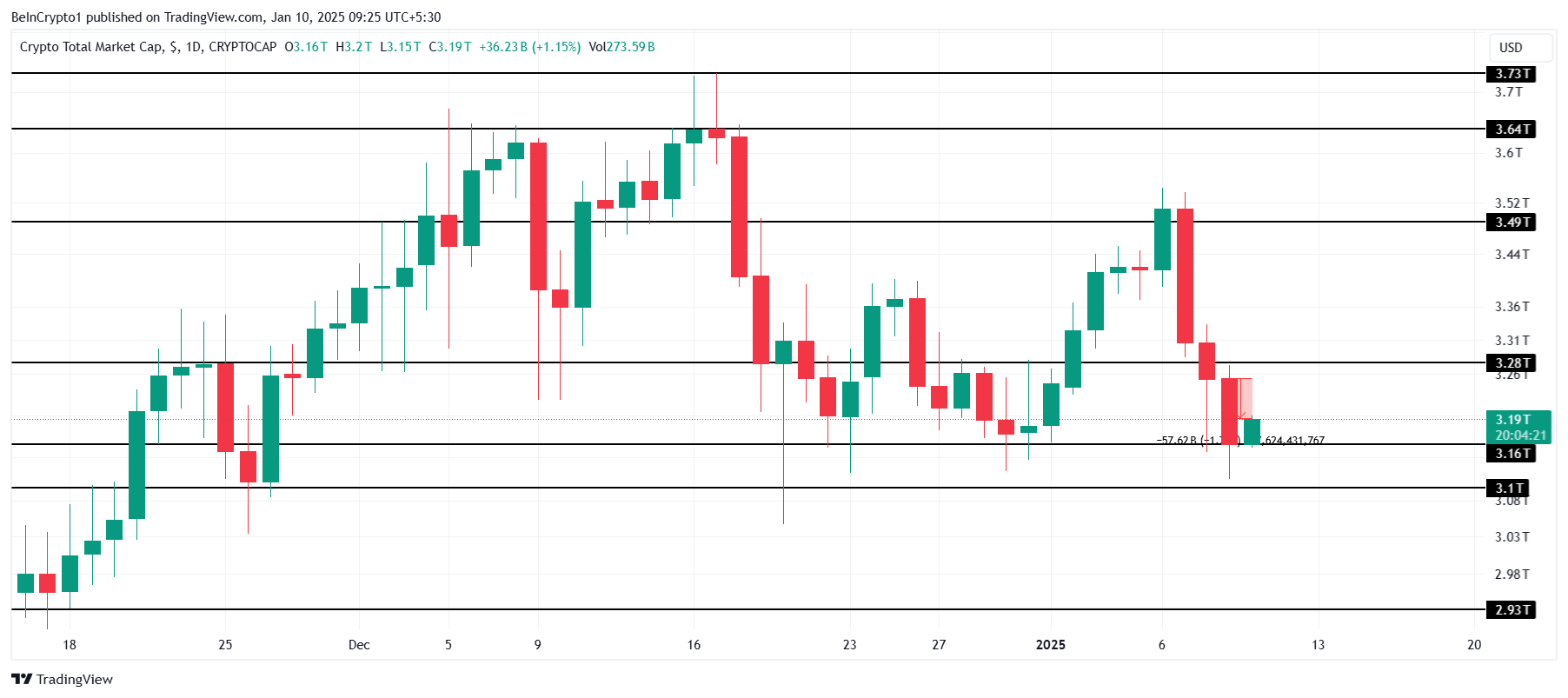 A capitalização total do mercado de criptomoedas (TOTALCAP) e o Bitcoin (BTC) registraram leves declínios hoje (10), o que teve um impacto maior nas altcoins. THORChain (RUNE) liderou o mercado ao registrar o maior declínio, caindo 18% para ser negociado a US$ 3,25.