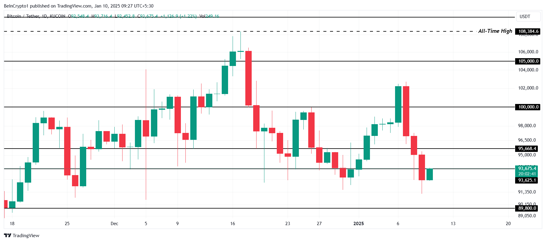 O Bitcoin está sendo negociado atualmente em US$ 93.675, mantendo-se logo acima do nível de suporte crucial de US$ 93.625. Isso ocorre após uma queda recente abaixo da marca nas últimas 24 horas. A incapacidade da criptomoeda de manter o momentum sinaliza uma crescente cautela do mercado, deixando os investidores atentos ao próximo movimento crítico.