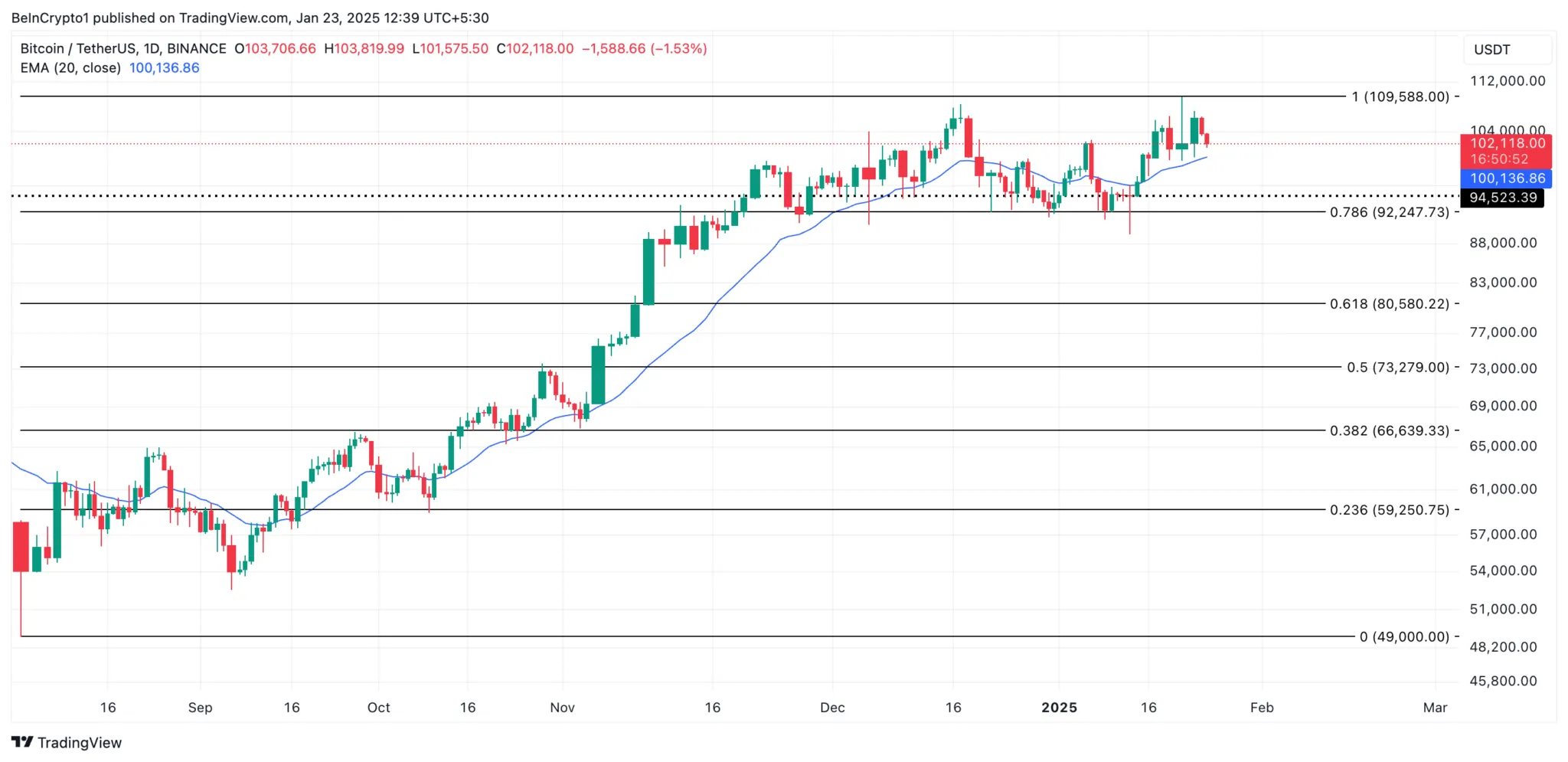 A principal criptomoeda, o Bitcoin, está atualmente sendo negociada a US$ 102.118, registrando uma queda de 3% no preço nas últimas 24 horas. No gráfico diário, o preço da moeda está caindo em direção à sua média móvel exponencial (EMA) de 20 dias, que forma um suporte dinâmico em US$ 100.136.