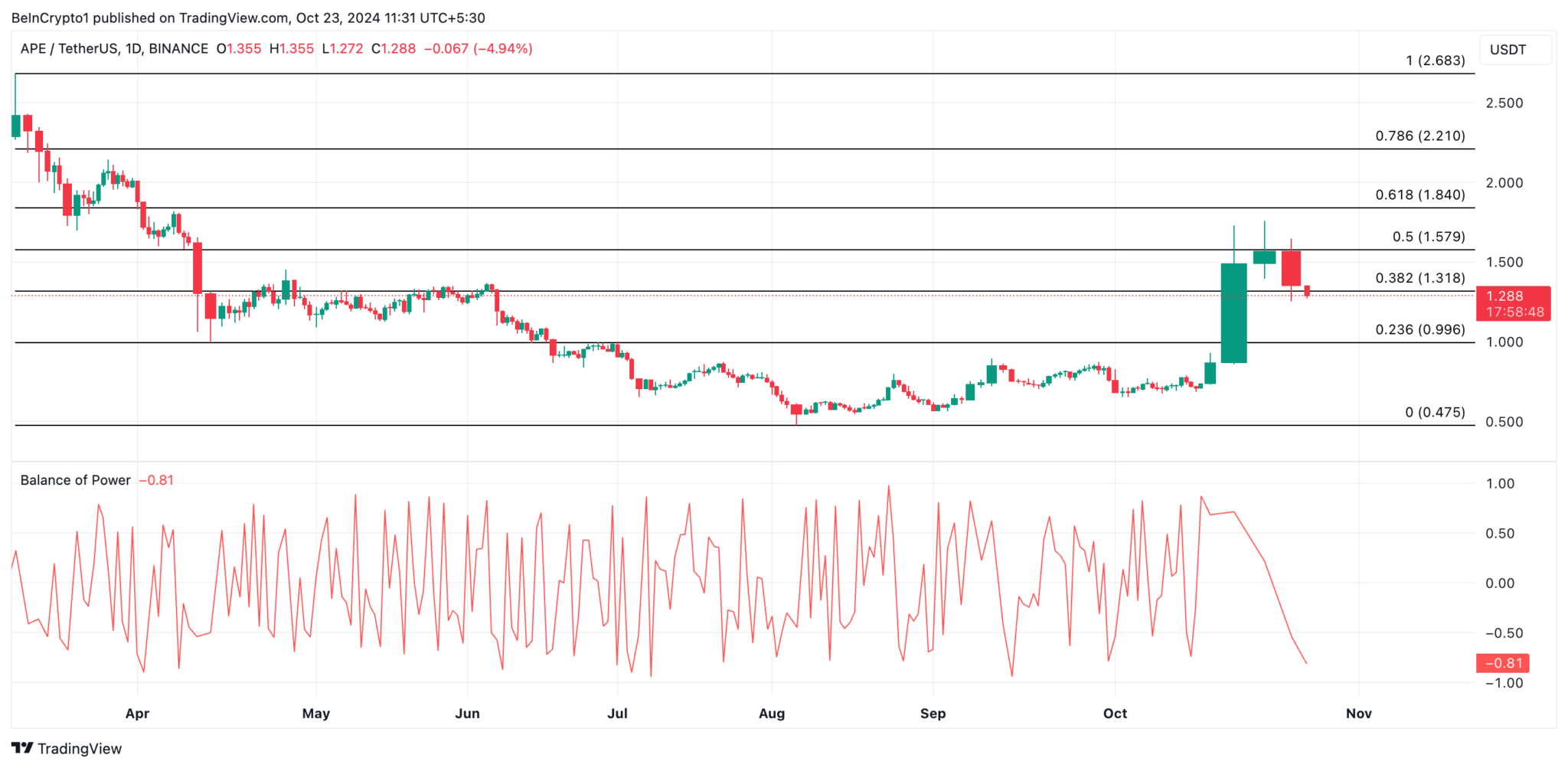 Após um aumento de 100% no preço após o lançamento da ApeChain, a APE começou a perder alguns de seus ganhos recentes. Negociado a US$ 1,28, a altcoin registrou um declínio de 15% em 24 horas.