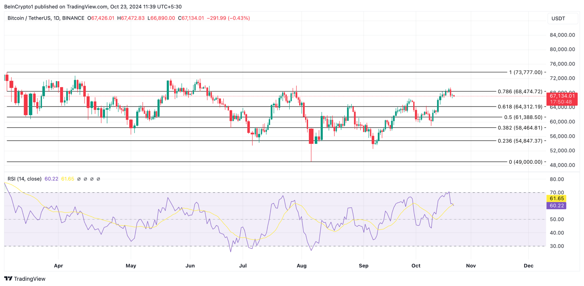 O Bitcoin é negociado atualmente a US$ 67.134, tendo perdido 1% de seu valor em 24 horas. A tendência de queda no Índice de Força Relativa (RSI) confirma o aumento na pressão de venda no mercado. Este indicador mede as condições de mercado de sobrecompra e sobrevenda de um ativo. Atualmente, o RSI do BTC é de 60,22.