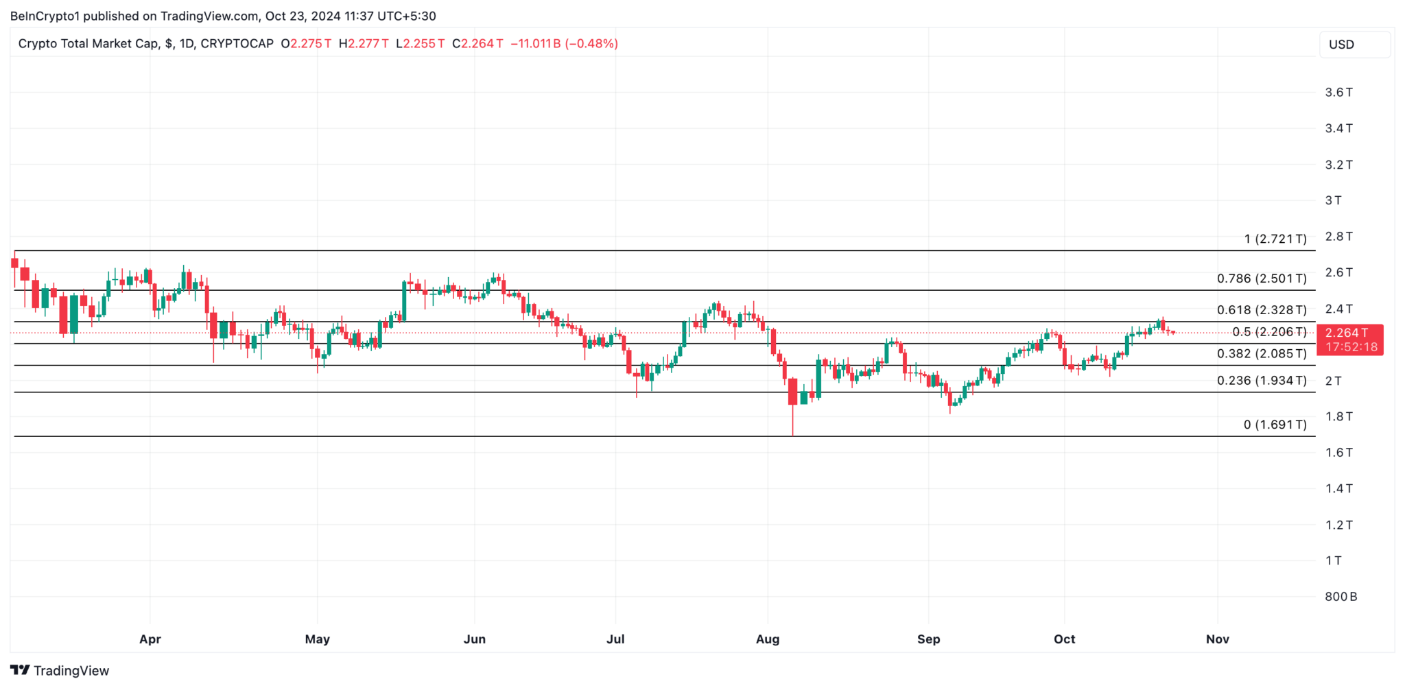 Por outro lado, se os traders se tornarem menos cautelosos e a atividade de negociação aumentar, o TOTALCAP pode tentar romper a resistência em US$ 2,32 trilhões. Um rompimento bem-sucedido acima desse nível abriria caminho para o preço subir para US$ 2,50 trilhões, nível visto pela última vez em junho.