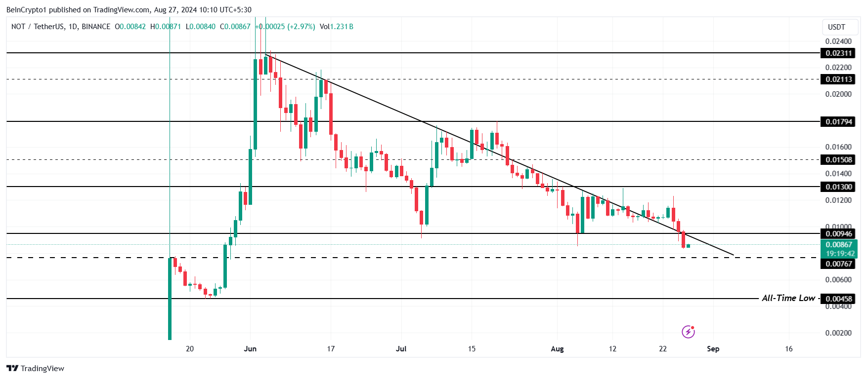O Notcoin quase escapou da linha de tendência de baixa de quase três meses. Mas, a queda de 27% nas últimas 72 horas levou a altcoin a cair abaixo da linha novamente.
