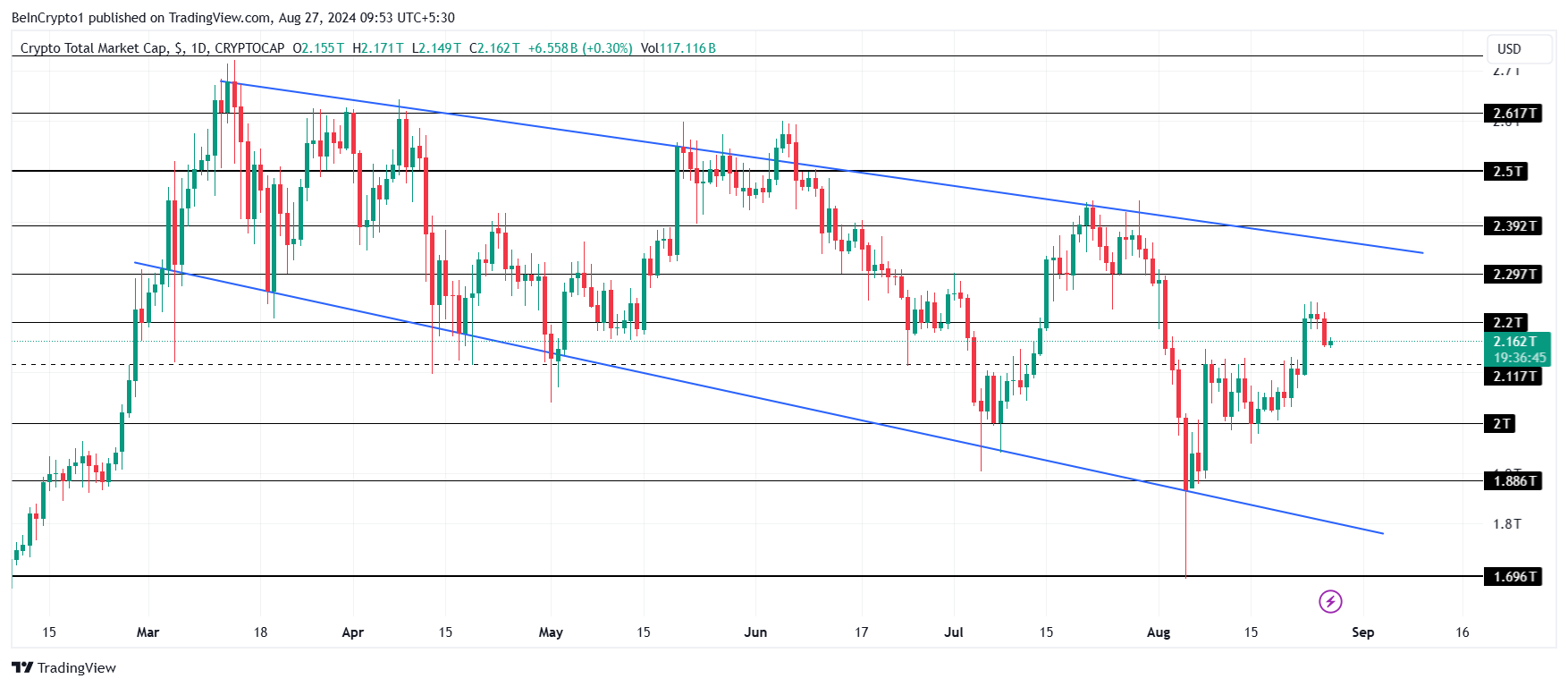 A capitalização total do mercado de criptomoedas (TOTALCAP) e o Bitcoin (BTC) foram afetados por um sentimento de baixa hoje devido a prisão do fundador do Telegram, Pavel Durov. Isso levou a uma queda de mais de 10% no Notcoin (NOT), um token associado à plataforma do Telegram.