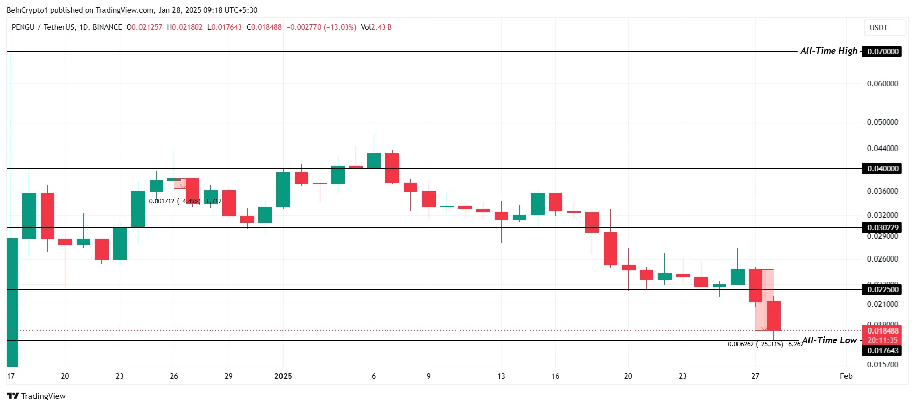 A PENGU teve o pior desempenho entre as 100 principais criptomoedas, caindo 25% nas últimas 24 horas. A altcoin atingiu uma nova mínima histórica de US$ 0,0176, destacando a intensa pressão de venda e a falta de suporte imediato dos investidores no atual ambiente de mercado.