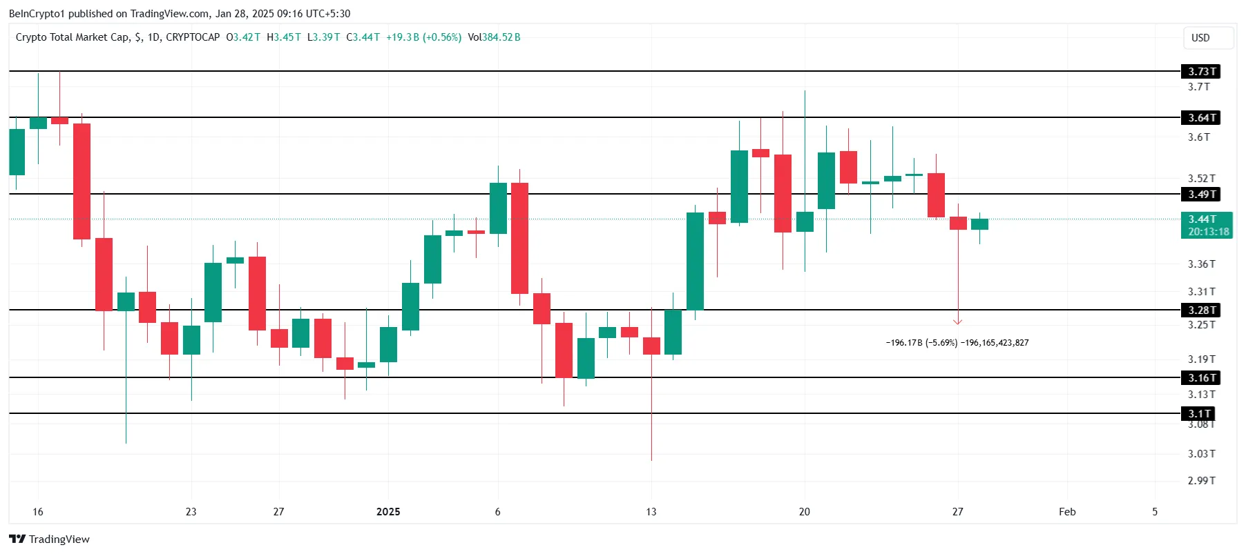 A capitalização total do mercado cripto (TOTALCAP) sofreu uma queda acentuada na segunda-feira (27), perdendo quase US$ 196 bilhões antes de se recuperar para US$ 3,44 trilhões. A volatilidade do mercado destaca os desafios contínuos enfrentados pelos ativos digitais, que lutam para manter a estabilidade em meio a mudanças no sentimento dos investidores e às condições macroeconômicas mais amplas.
