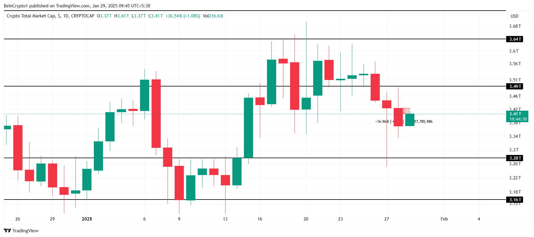 Atualmente em US$ 3,41 trilhões, o TOTALCAP precisa de um forte impulso de compra para evitar novas quedas. Sem uma recuperação significativa, a capitalização de mercado pode continuar sua tendência de baixa, possivelmente recuando para o suporte de US$ 3,28 trilhões. Manter-se acima desse nível é essencial para evitar perdas mais profundas.