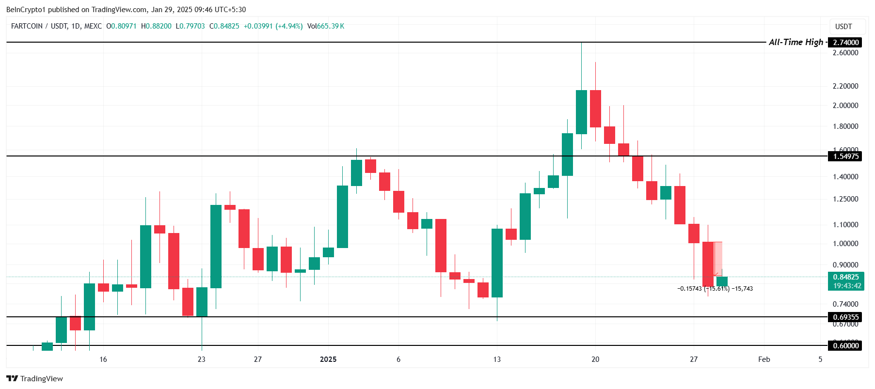 Se a tendência de baixa persistir, a FARTCOIN pode cair ainda mais para US$ 0,693, um nível de suporte recentemente testado. Manter esse nível é crucial para evitar uma queda mais profunda para US$ 0,600. Os investidores permanecem cautelosos, observando sinais de estabilização antes de realizar novas entradas no mercado.