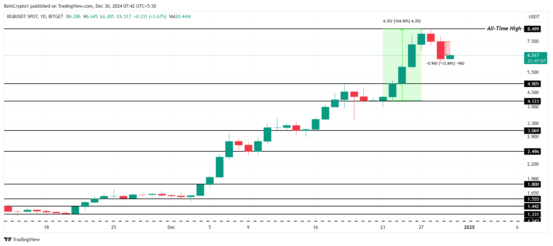 O preço do BGB caiu 12% no dia, negociado atualmente a US$ 6,51. Essa queda afasta ainda mais a altcoin de sua máxima histórica (ATH) de US$ 8,49, levantando preocupações sobre suas perspectivas de recuperação imediata.