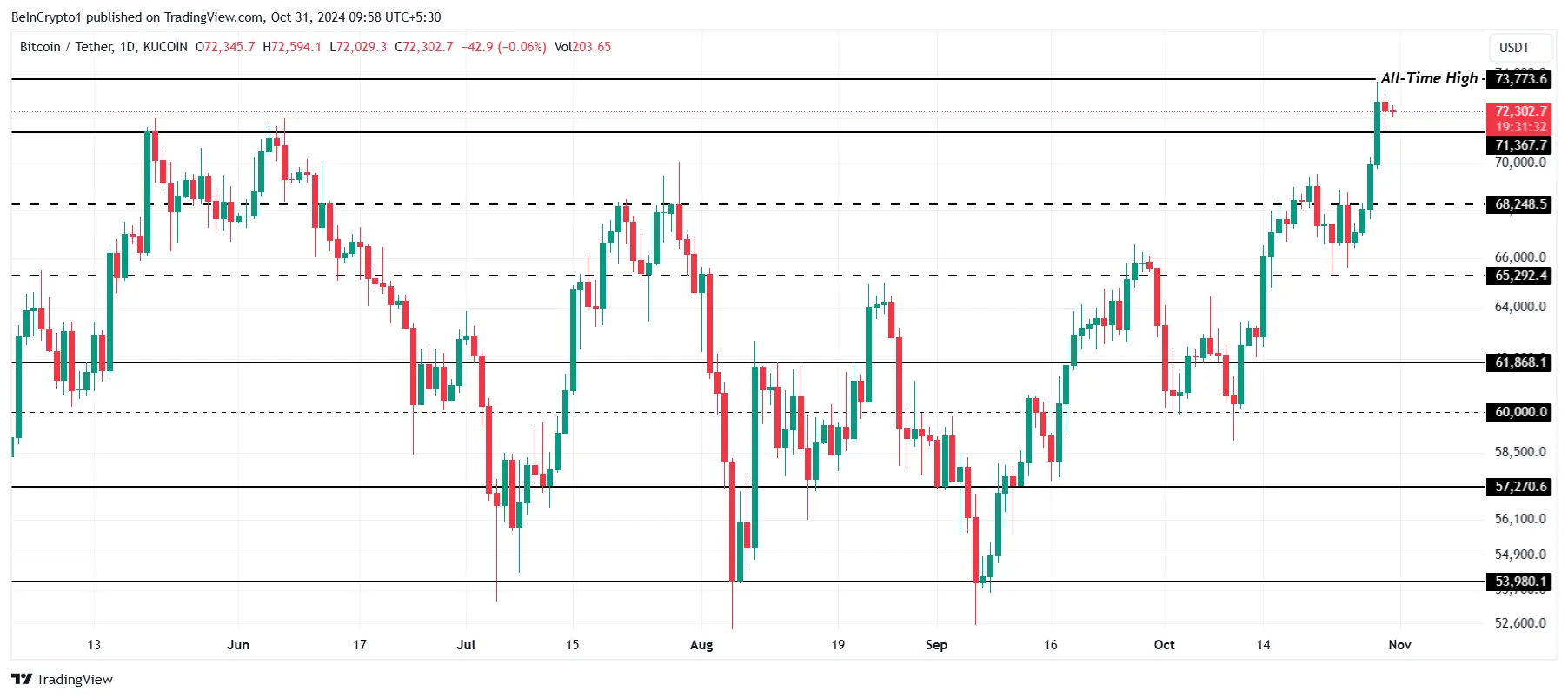 Se os investidores permanecerem otimistas e mantiverem suas posições, o ativo pode ultrapassar sua ATH de US$ 73.800. Romper essa resistência seria um marco significativo, empurrando o Bitcoin ainda mais para o território otimista e reforçando a confiança do mercado.