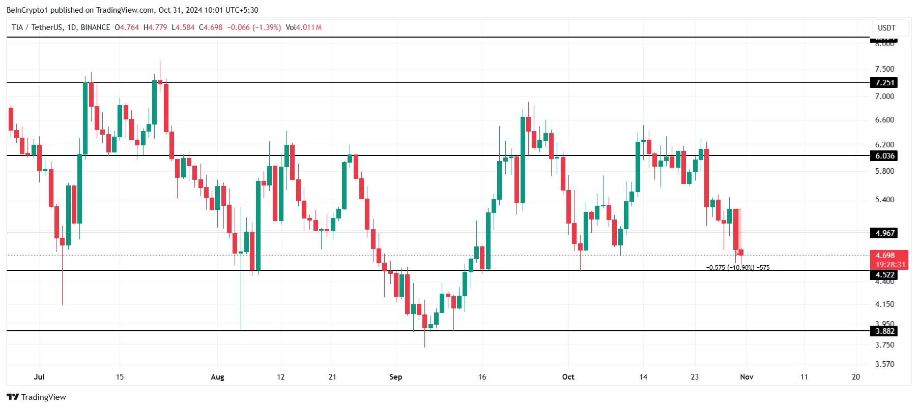 No entanto, se o suporte de US$ 4,52 for perdido, a Celestia pode cair para US$ 3,88, marcando uma baixa de um mês e meio. Essa queda pode atrasar qualquer recuperação potencial, pois sinalizaria uma perspectiva de baixa mais profunda para a altcoin.