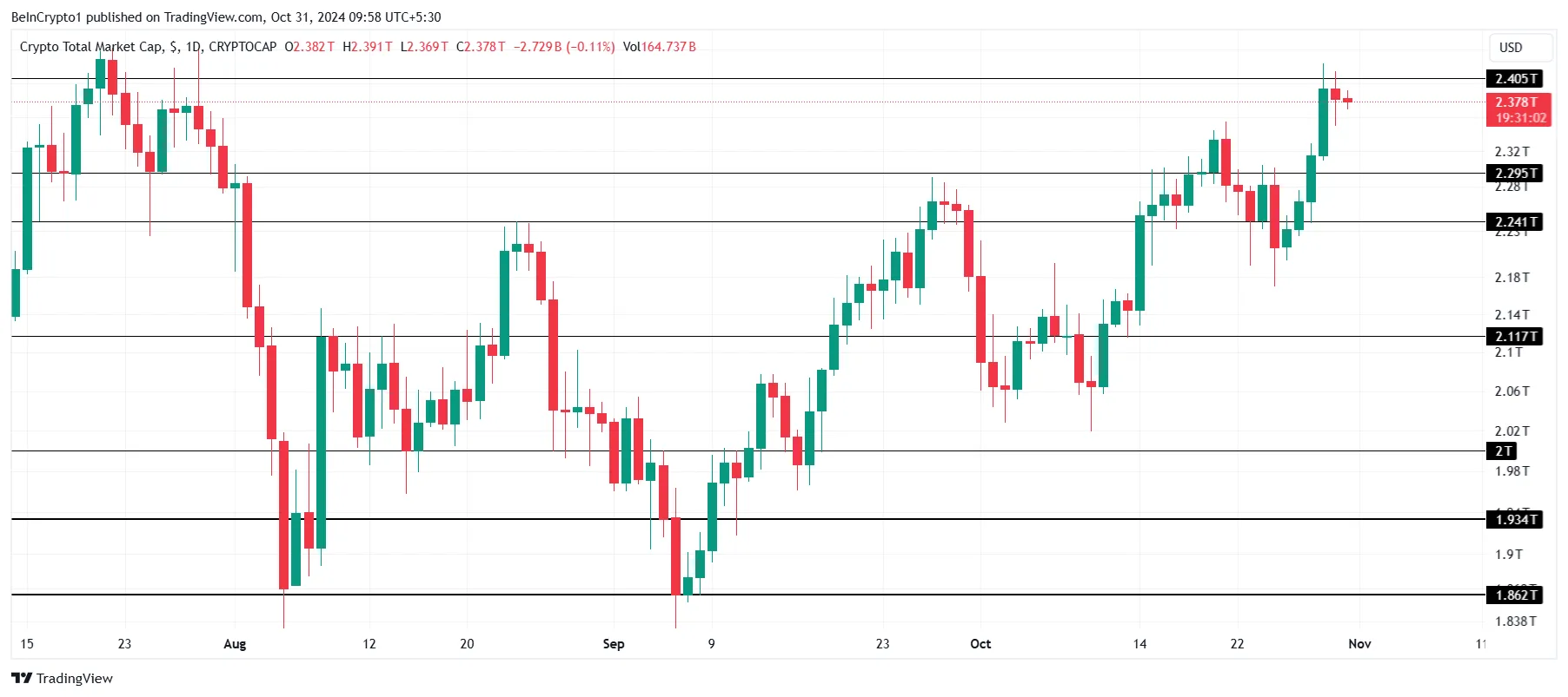 A capitalização total do mercado de criptomoedas sofreu um leve declínio, já que não conseguiu romper a resistência de US$ 2,40 trilhões. Esse nível provou ser desafiador, diminuindo o entusiasmo otimista de curto prazo e estimulando o sentimento cauteloso dos investidores.