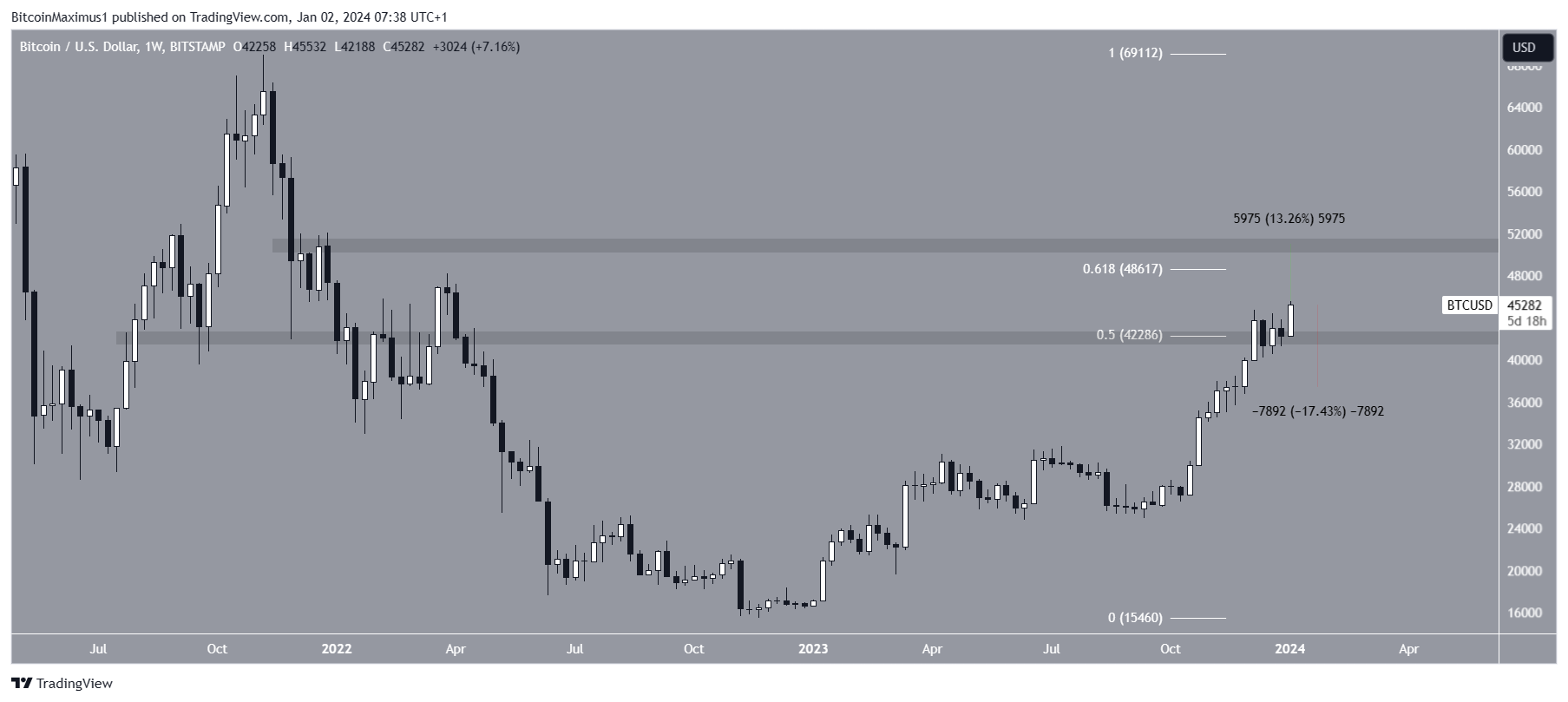Assim como o TOTALCAP, o Bitcoin está em tendência de alta desde outubro. O movimento causou um rompimento acima do nível de retração de 0,5 de Fibonacci em US$ 42.300.