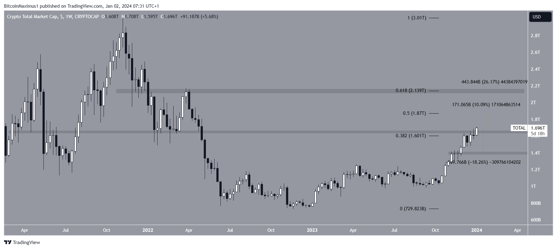 A capitalização do mercado de criptomoedas subiu rapidamente desde outubro. Nas últimas duas semanas, o preço lutou para chegar a um fechamento acima da área de resistência de US$ 1,65 trilhão, uma área de resistência horizontal que quase coincide com o nível de retração de 0,382 de Fibonacci.