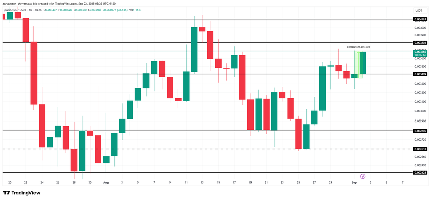 O preço da PUMP subiu 9,6% nas últimas 24 horas, sendo negociado a US$ 0,0036 no momento da redação deste texto. A altcoin está atualmente logo abaixo da resistência de US$ 0,0038, mantendo US$ 0,0034 como nível de suporte, demonstrando resiliência na manutenção da estabilidade de curto prazo.