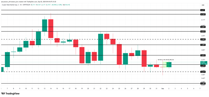 O valor total do mercado de criptomoedas subiu US$ 41 bilhões, atingindo US$ 3,75 trilhões no momento da redação deste texto. O TOTAL está sendo negociado acima do nível de suporte de US$ 3,73 trilhões, sinalizando força no curto prazo.