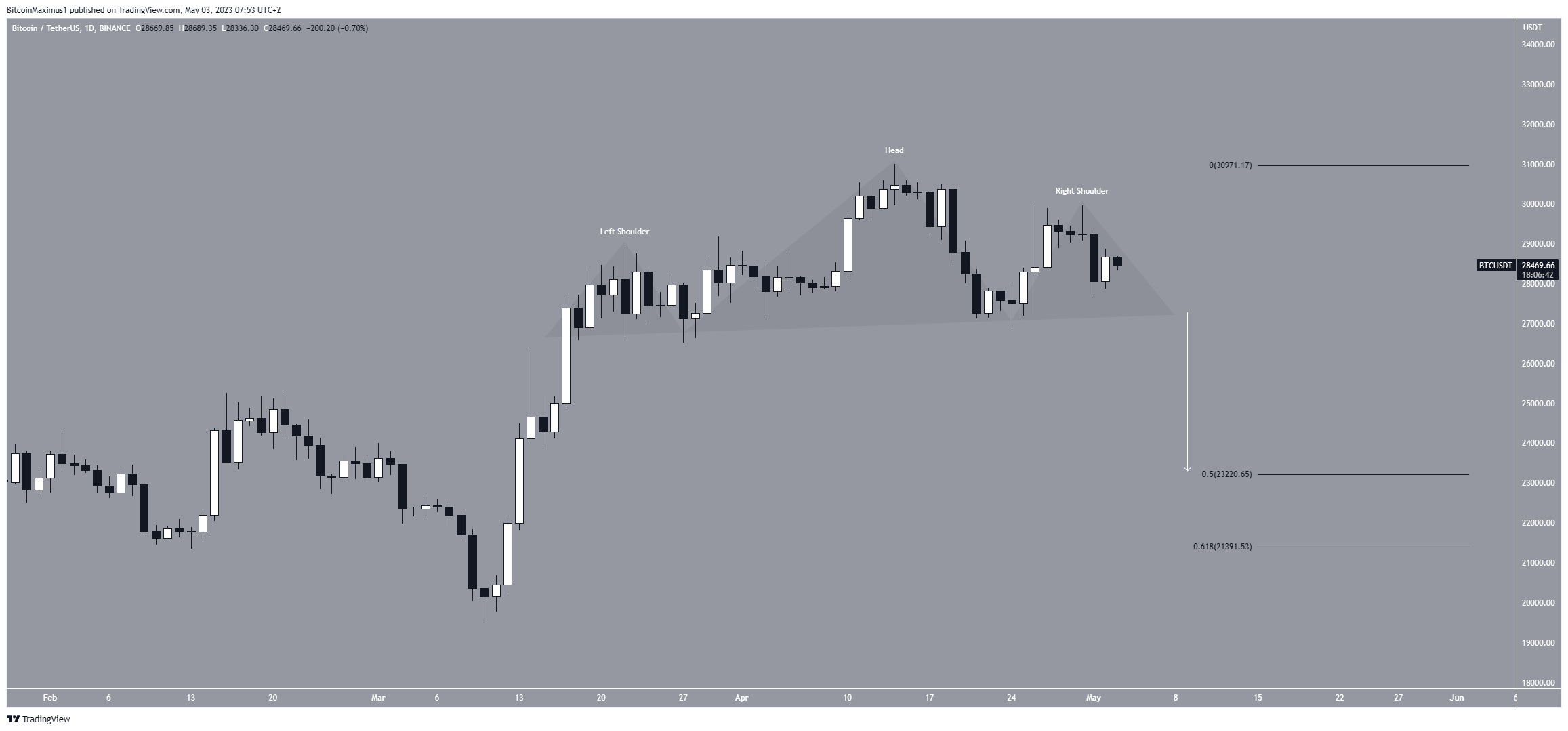 Desde 17 de março, o preço do Bitcoin segue um padrão de ombro-cabeça-ombro, que muitas vezes é considerado de baixa, pois geralmente leva a novas quedas de preços. Atualmente, a linha desse padrão está em US$ 27.500.