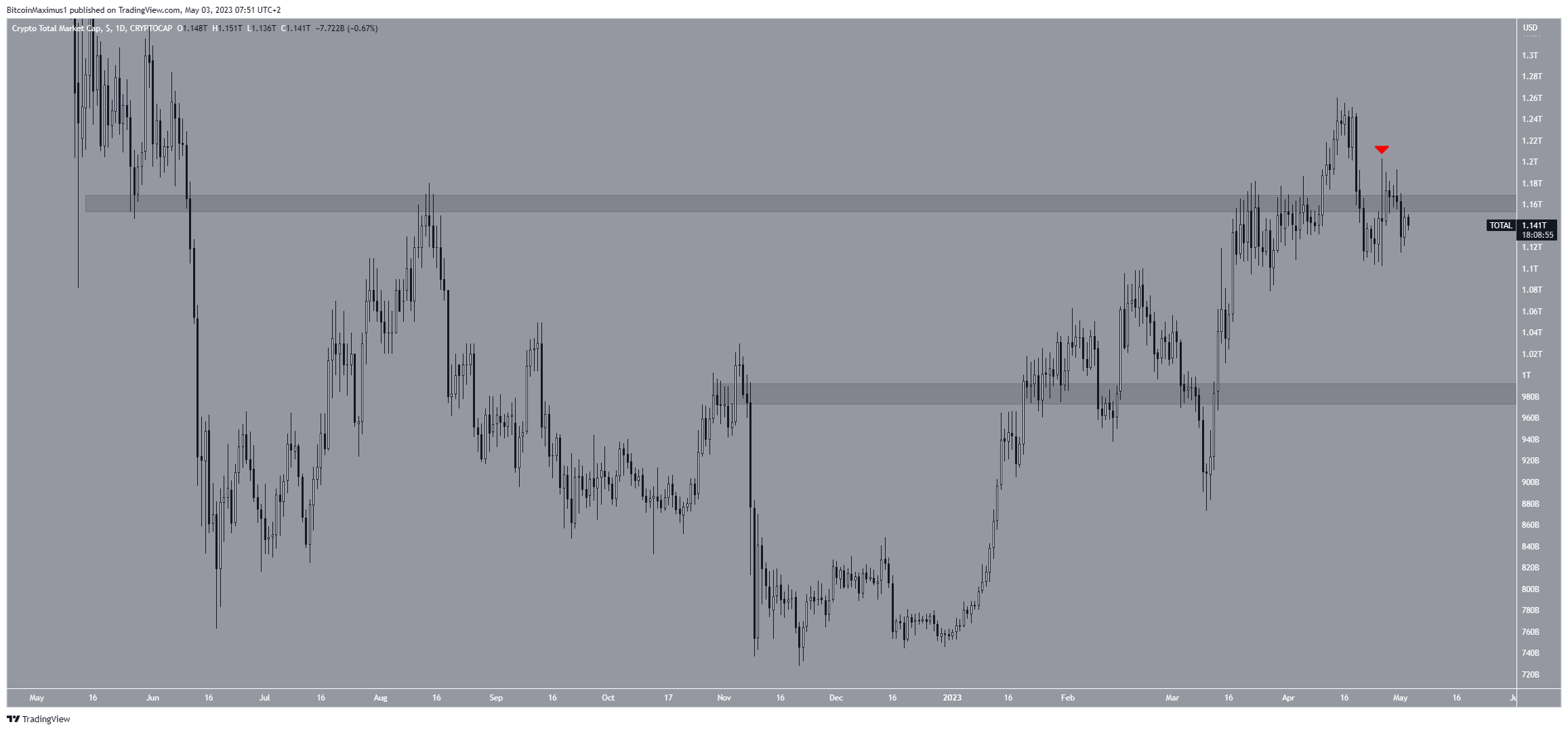 O TOTALCAP está em queda desde 14 de abril. Ele caiu abaixo da área horizontal de US$ 1,16 trilhão em 20 de abril. Após uma recuperação malsucedida, ele a validou como resistência quatro dias depois (ícone vermelho).