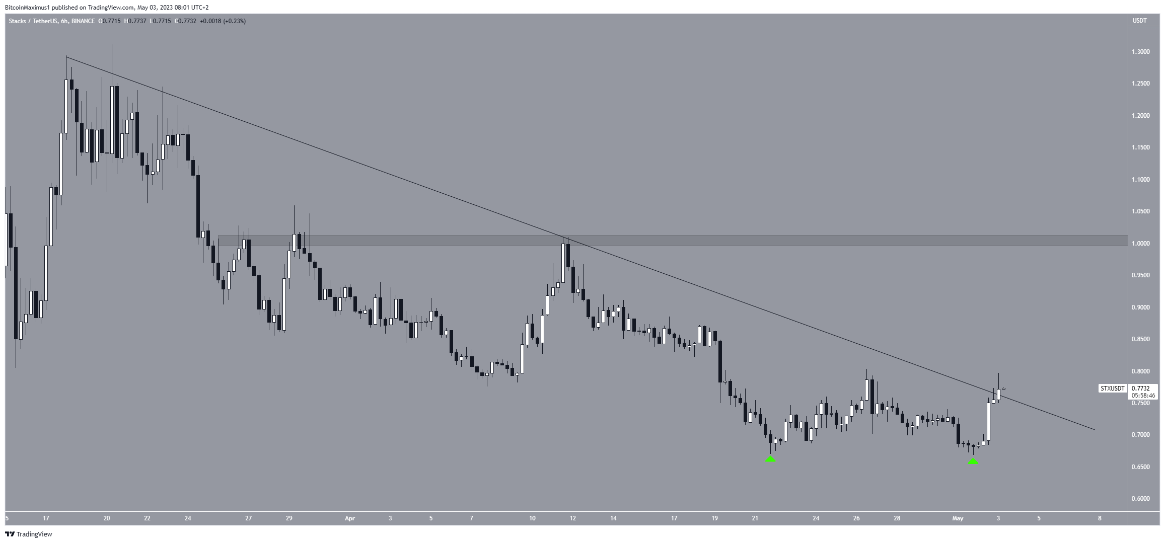 O preço do STX caiu sob uma linha de tendência de baixa desde 20 de março. Durante esse período, ele fez várias tentativas de rompimento.