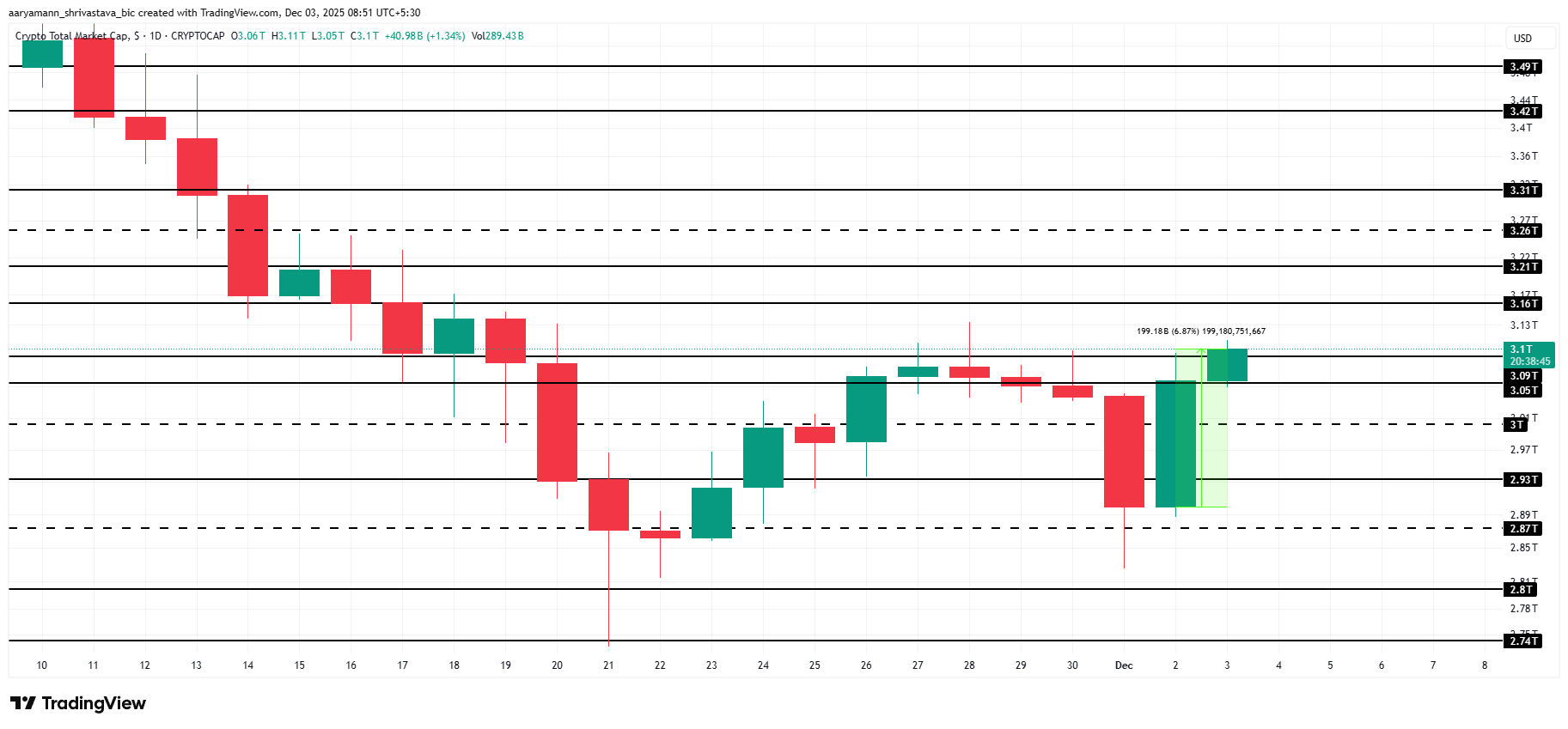 A capitalização total do mercado de criptomoedas aumentou em US$ 200 bilhões nas últimas 24 horas, atingindo US$ 3,10 trilhões. A criptomoeda TOTAL teve uma forte alta após o Federal Reserve dos EUA encerrar o aperto quantitativo na terça-feira. Isso está melhorando o apetite por risco e impulsionando fortes fluxos de entrada nas principais criptomoedas.