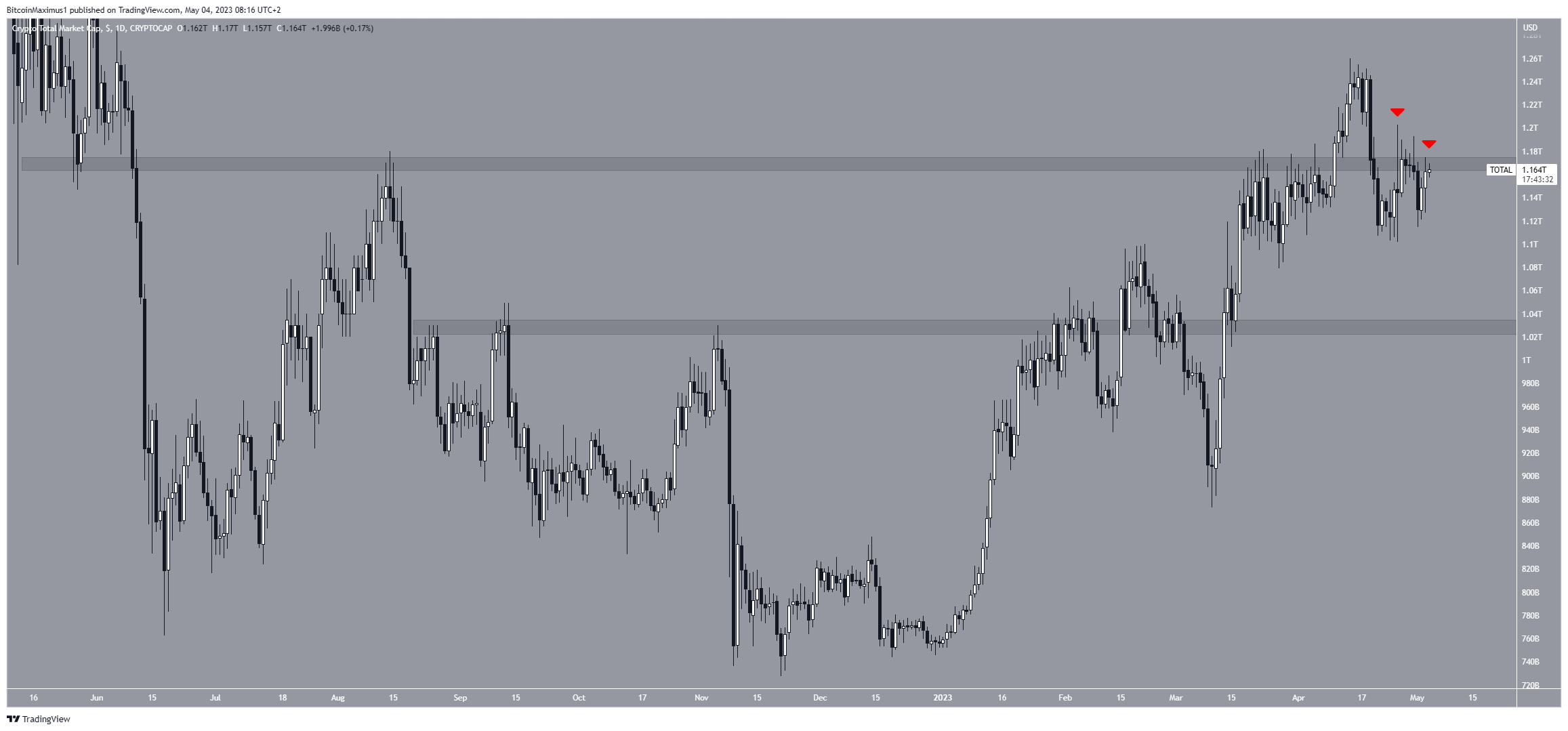 O TOTALCAP está em queda desde 14 de abril. Seu valor caiu abaixo do nível de US$ 1,16 trilhão em 20 de abril. Apesar de uma recuperação malsucedida, esse nível foi validado como resistência quatro dias depois (indicado em vermelho).