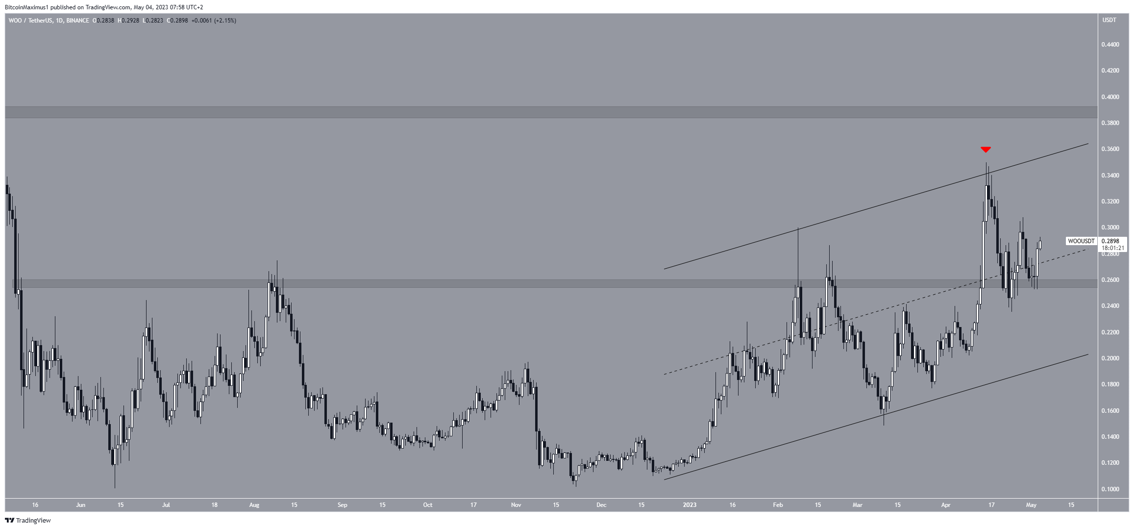 A WOO aumentou dentro de um canal paralelo de alta de longo prazo desde o início do ano. Em 15 de abril, o preço caiu após ser rejeitado pela linha de resistência do canal.