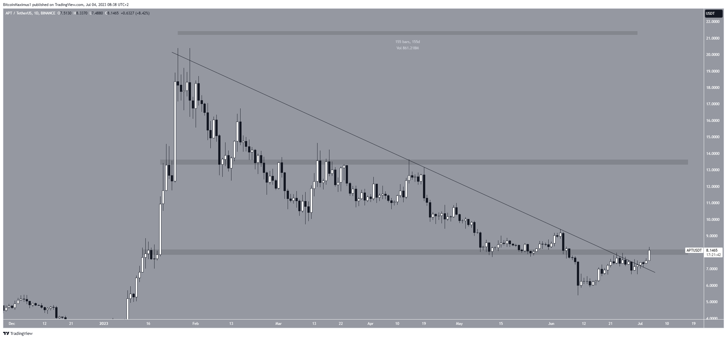 Rompimentos dessas estruturas de longo prazo geralmente levam a movimentos significativos de alta. Atualmente, o APT é negociado dentro da área de resistência de US$ 8,15.