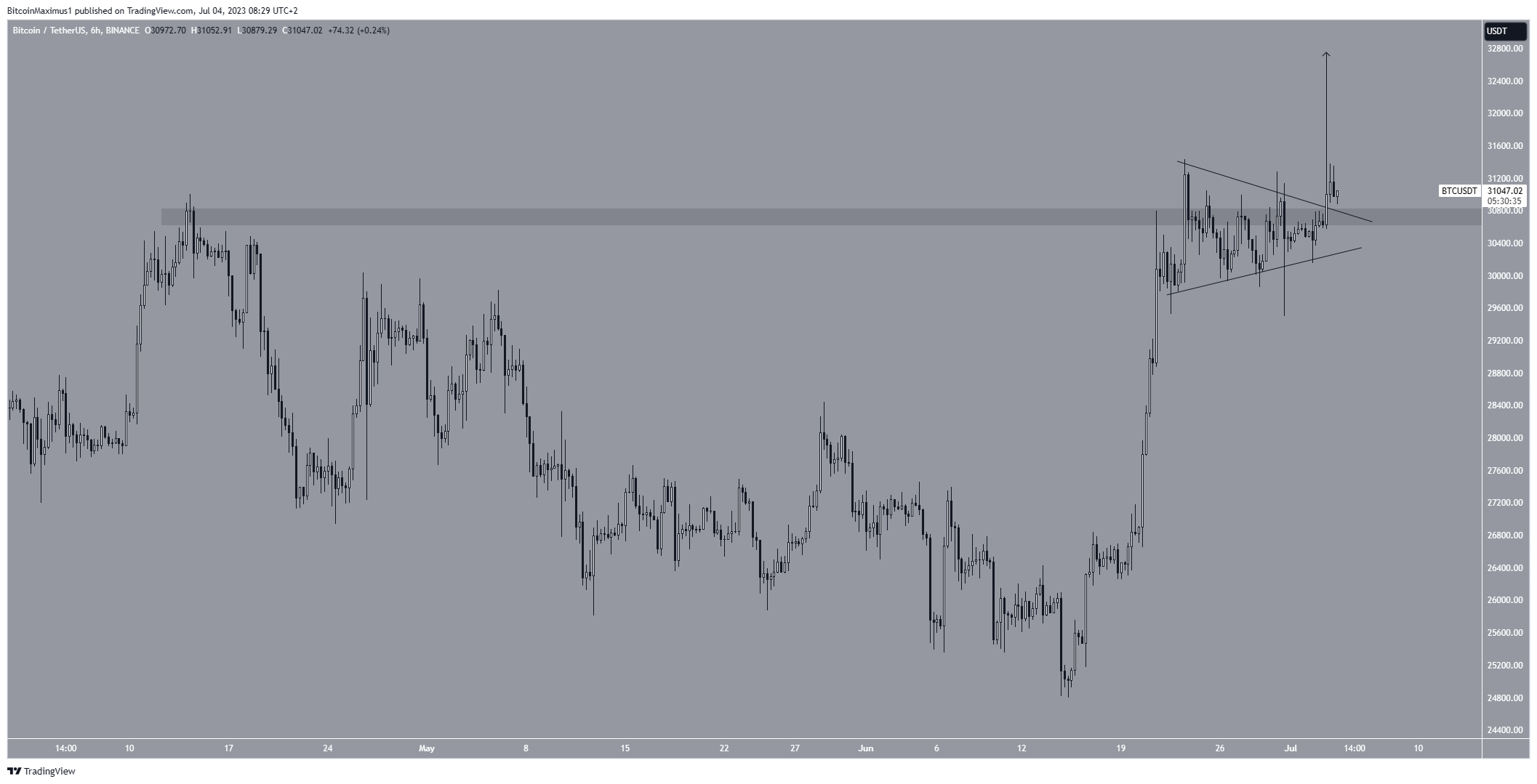 Em 23 de junho, o Bitcoin atingiu uma nova máxima anual de US$ 31.431, superando o nível de resistência de US$ 30.650. No entanto, não conseguiu fechar acima desse limite, indicando que o rompimento ainda não foi confirmado.