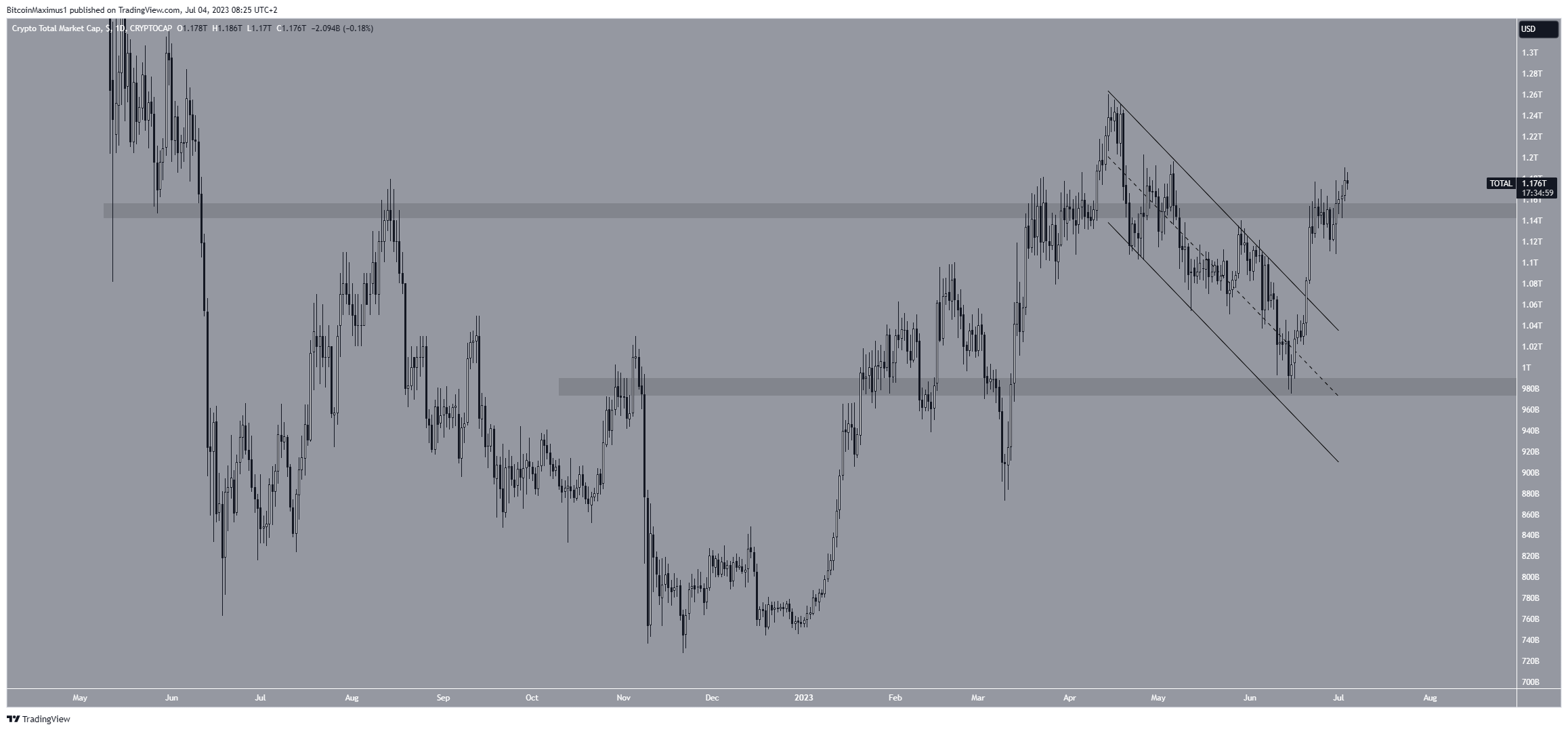 O TOTALCAP experimentou um crescimento após sua recuperação no nível de suporte de US$ 980 bilhões por volta de 15 de junho. Cinco dias depois, o preço ultrapassou um canal paralelo de baixa estabelecido desde 14 de abril. Isso confirmou a conclusão da fase de correção e sinalizou o início de um novo movimento de alta.