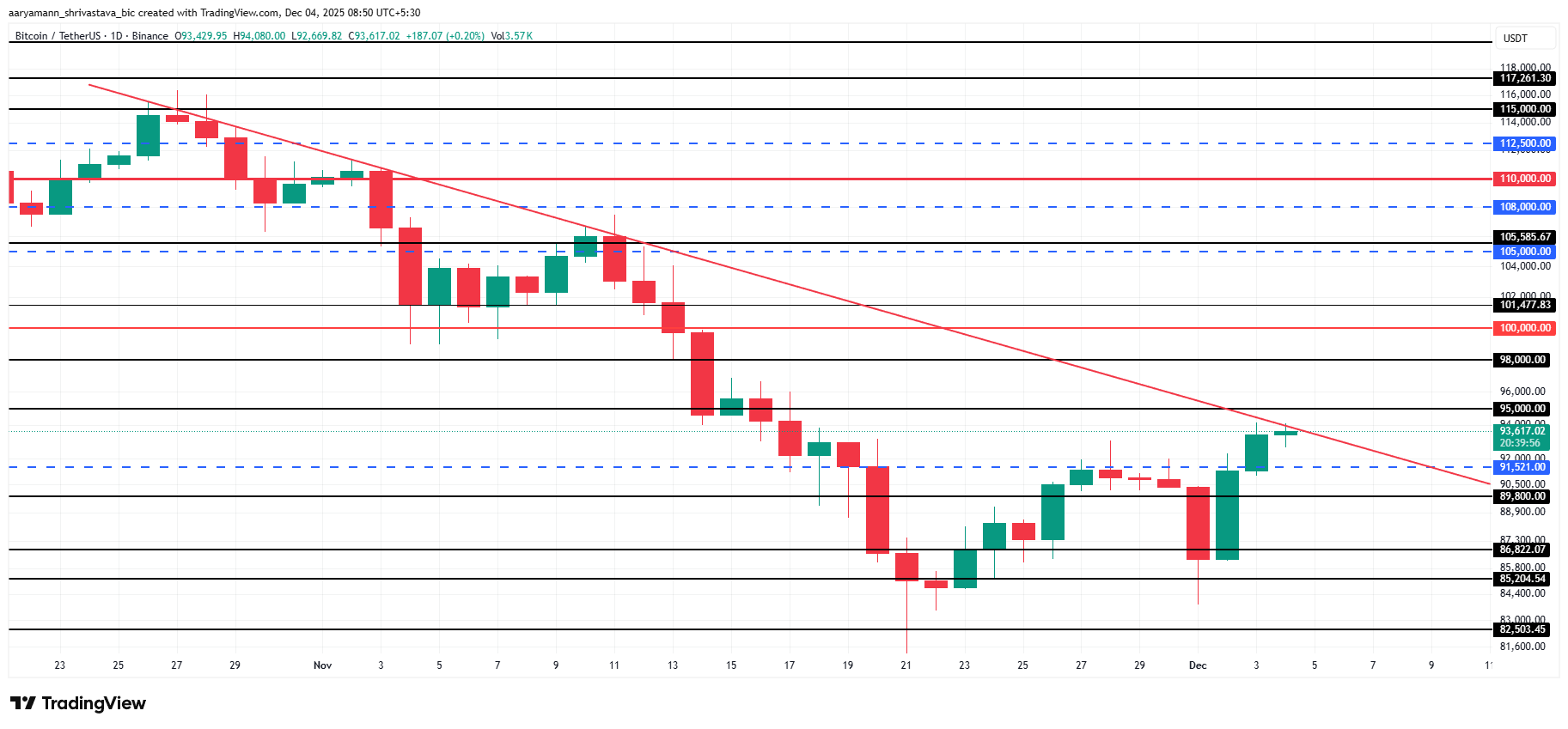 O preço do Bitcoin está testando sua tendência de baixa de cinco semanas pela quarta vez, estando em US$ 93.617 no momento da redação deste texto. Romper essa barreira de longa data é essencial para que o rei das criptomoedas confirme uma recuperação sustentável e recupere o ímpeto de alta perdido no mercado em geral.