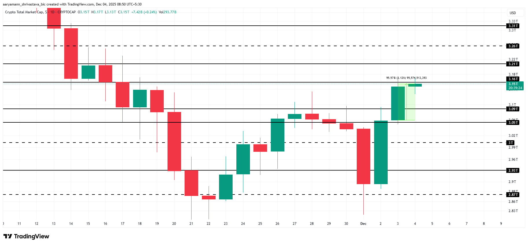 A TOTAL agora mira o nível de resistência de US$ 3,16 trilhões, que precisa ser rompido para manter o ímpeto de alta. Garantir que esse nível se mantenha como um suporte estável será crucial para sustentar essa valorização e permitir uma ascensão ainda maior em direção a US$ 3,21 trilhões.