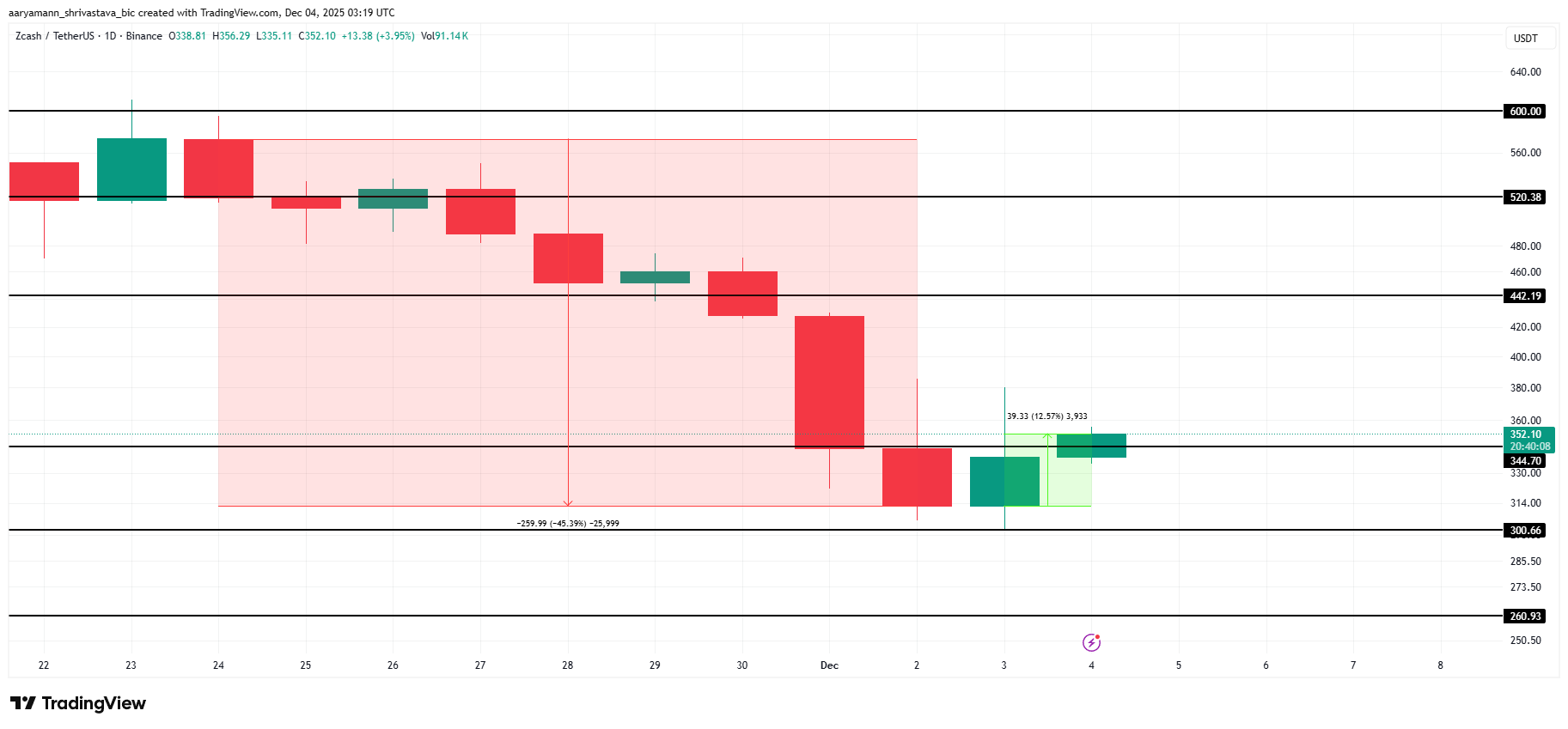 No entanto, se as tentativas de recuperação perderem força e a pressão baixista retornar, a ZEC poderá recuar em direção à zona de suporte de US$ 300. Uma queda abaixo desse nível invalidaria a perspectiva otimista e sinalizaria o risco de uma desvalorização mais acentuada.