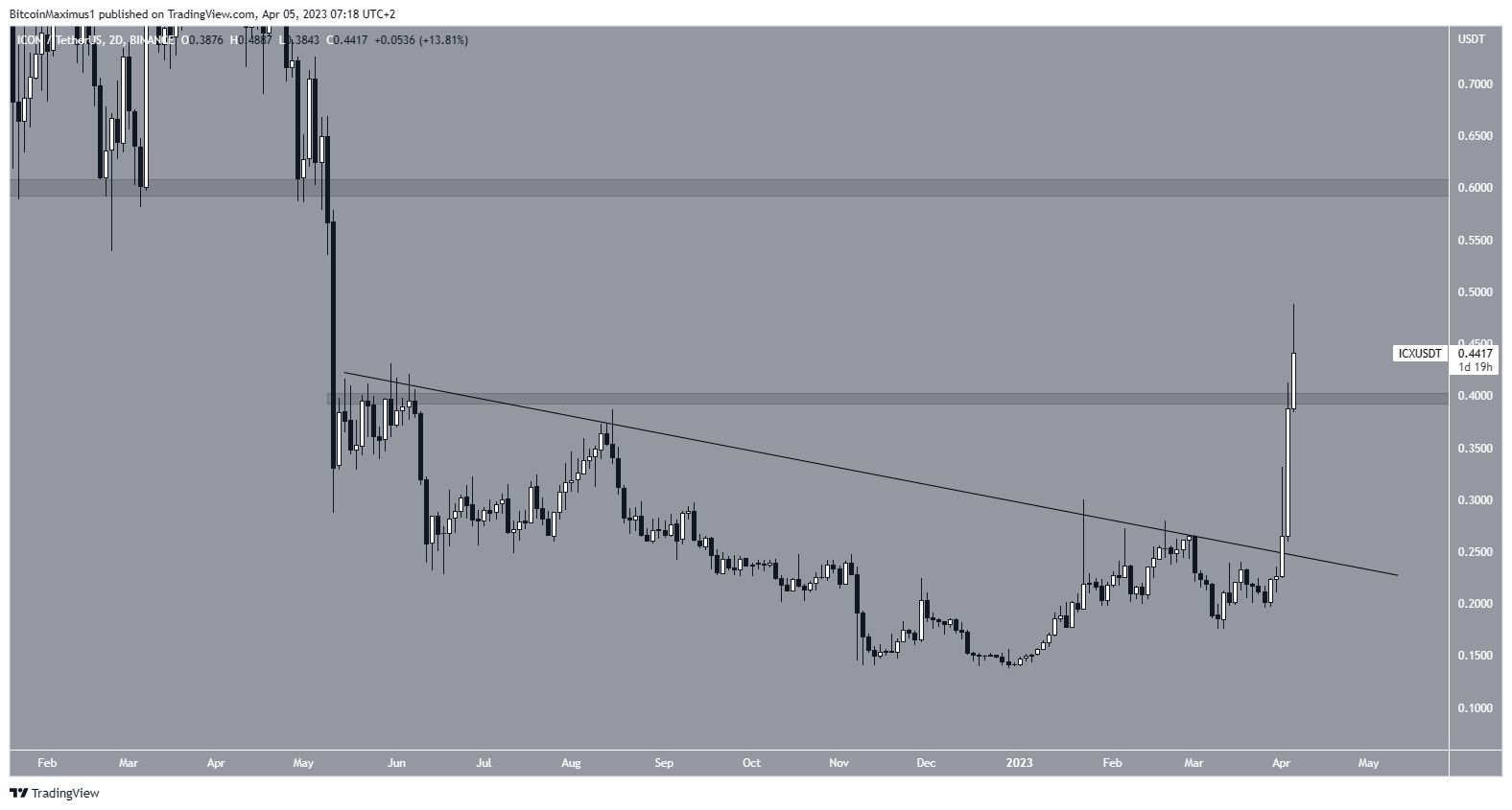 O preço do ICX subiu em um ritmo acelerado nos últimos cinco dias. O movimento levou a uma nova máxima anual de US$ 0,49 em 5 de abril. Embora o preço esteja criando um longo pavio superior, ele ainda é negociado acima da área horizontal de US$ 0,40, que agora deve atuar como suporte.