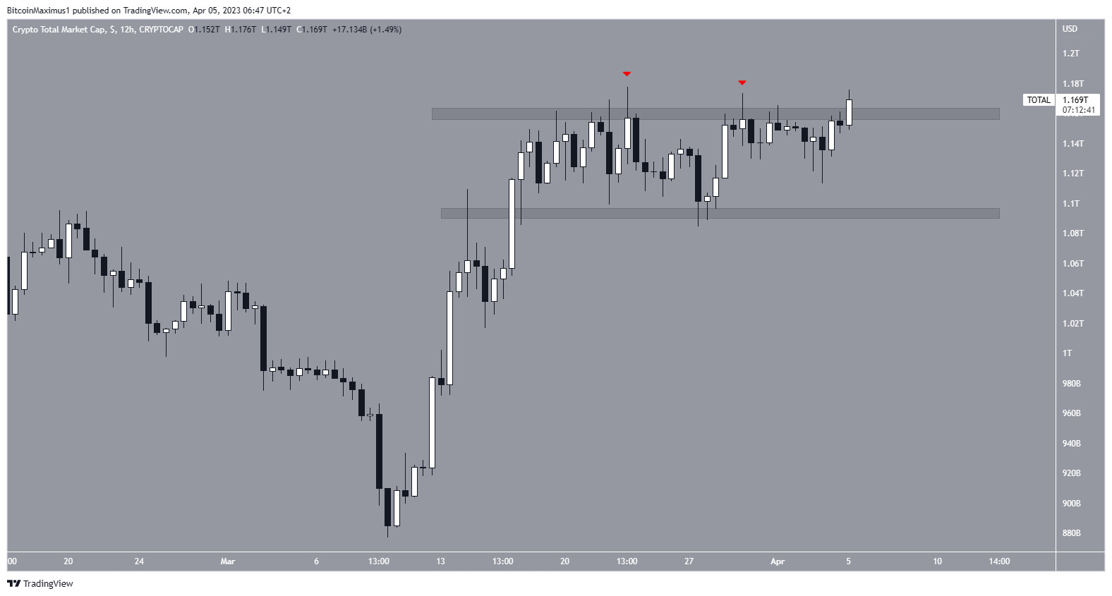 O TOTALCAP estava negociado em uma faixa entre US$ 1,09 trilhão e US$ 1,16 trilhão desde 14 de março. Tanto a faixa alta quanto a baixa foram validadas inúmeras vezes. Atualmente, a capitalização está em processo de sair da faixa de alta.
