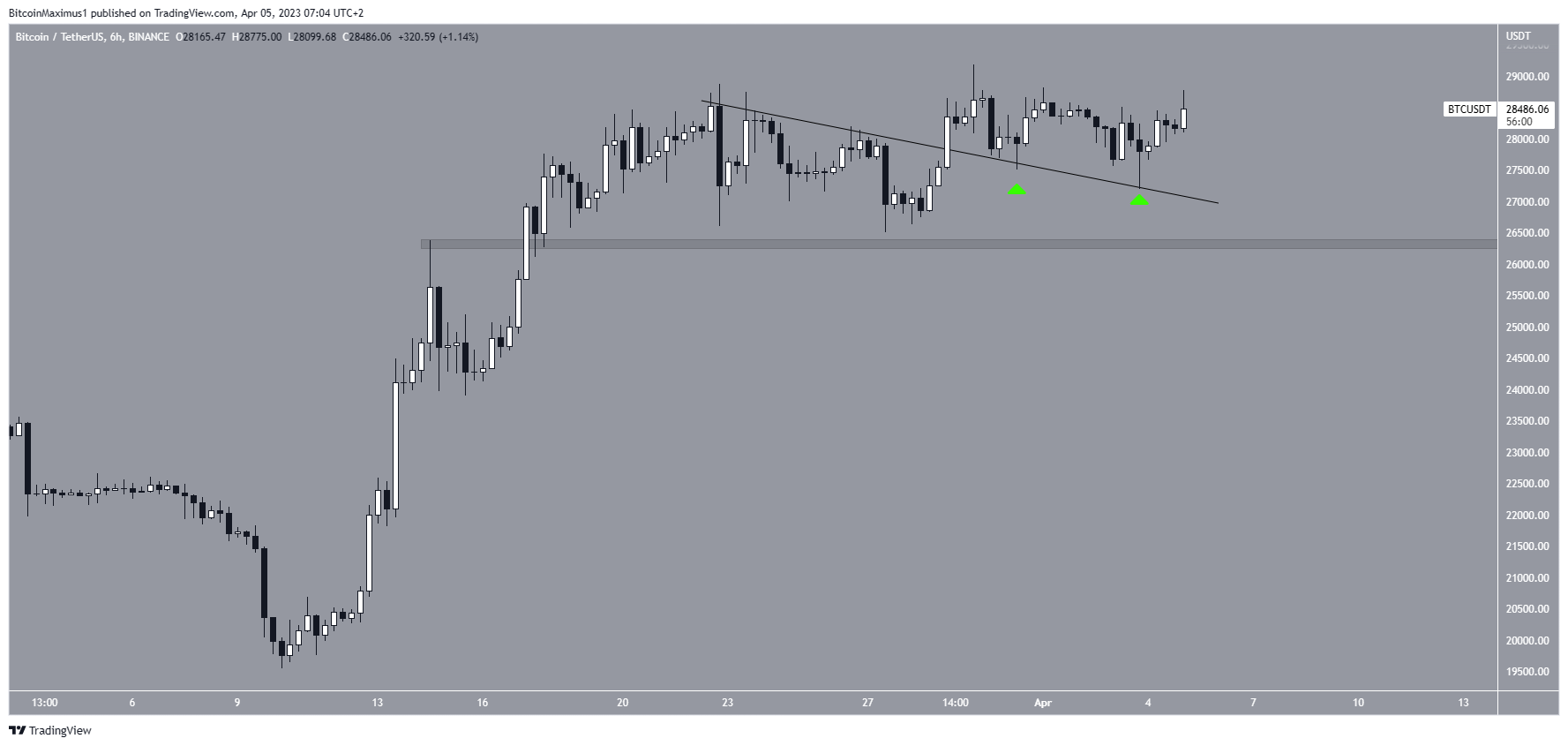 O preço do Bitcoin saiu de uma linha de tendência de baixa em 29 de março, atingindo uma nova máxima anual de US$ 29.184 dois dias depois. Embora o preço tenha caído desde então, ele validou a linha de resistência anterior duas vezes (ícones verdes), criando sombras mais baixas a cada vez.