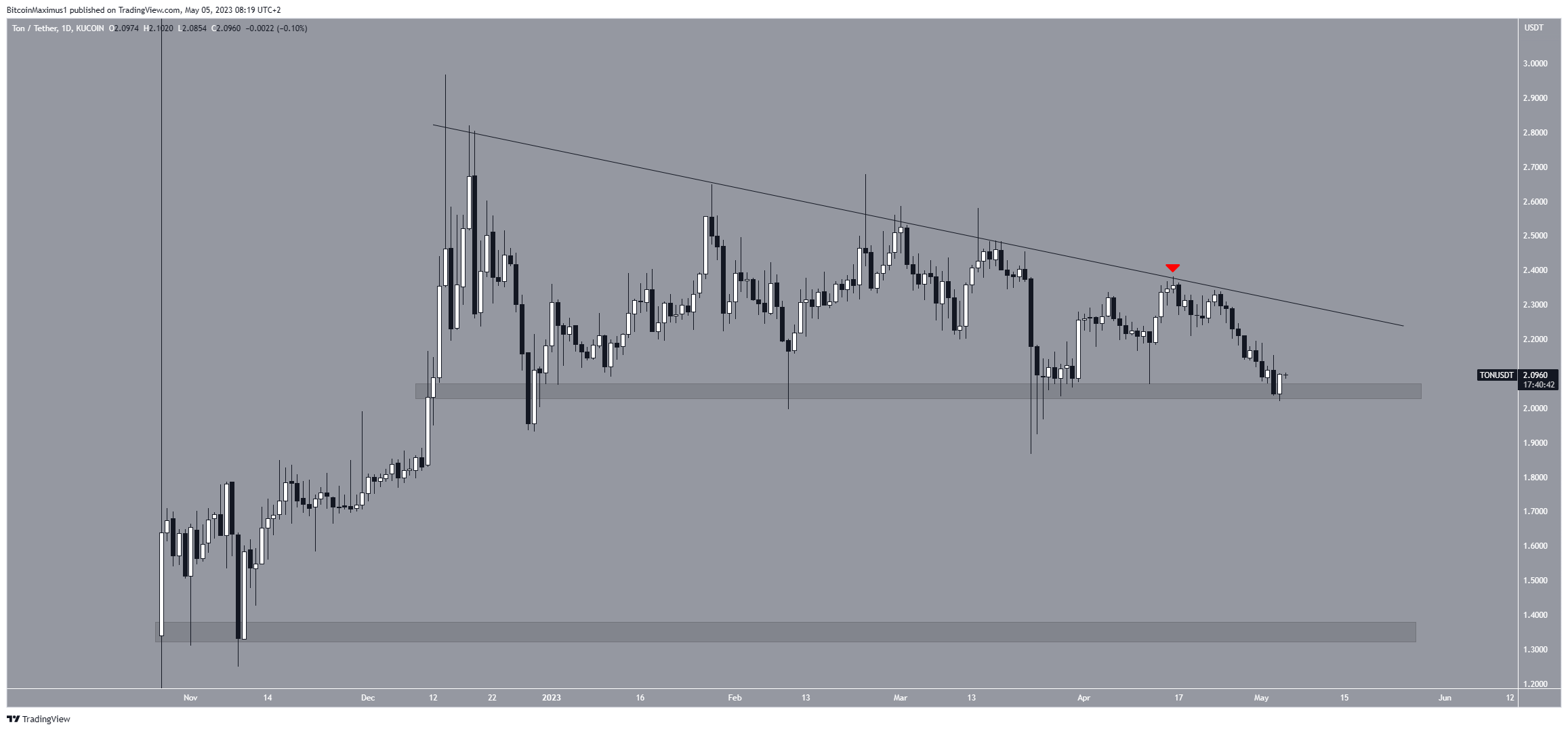 O preço do TON é negociado em um triângulo de baixa desde dezembro de 2022. Mais recentemente, foi rejeitado pela linha de resistência do triângulo em 20 de abril (ícone vermelho).