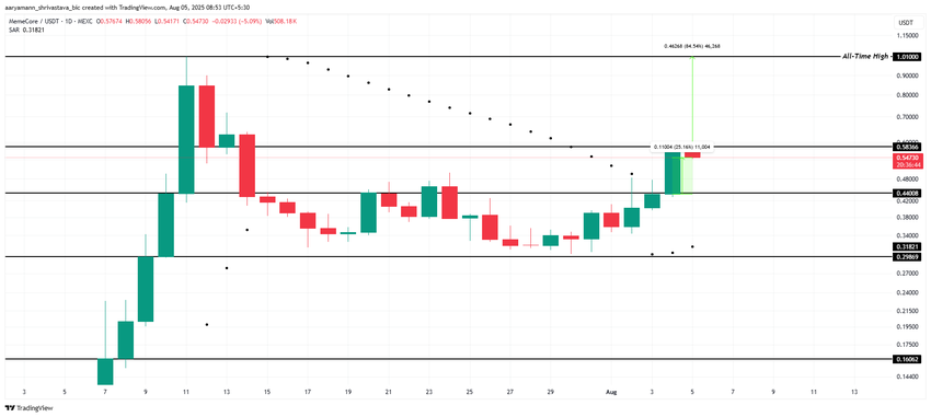 A Memecore subiu 25% nas últimas 24 horas, atingindo US$ 0,547. Apesar de não ter conseguido romper a resistência de US$ 0,583, a altcoin permanece em alta. Seu forte desempenho hoje manteve a confiança dos investidores elevada, com a criptomoeda demonstrando potencial para novos ganhos.