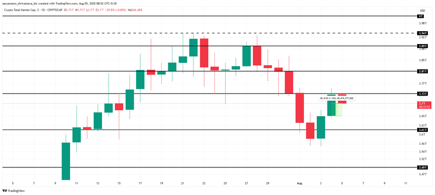 O valor total do mercado de criptomoedas aumentou em US$ 42 bilhões nas últimas 24 horas, atingindo US$ 3,70 trilhões. Apesar desse movimento positivo, o mercado enfrentou resistência em US$ 3,73 trilhões, impedindo novos ganhos. Esse nível permanece crítico para a continuidade do impulso ascendente do mercado de criptomoedas.