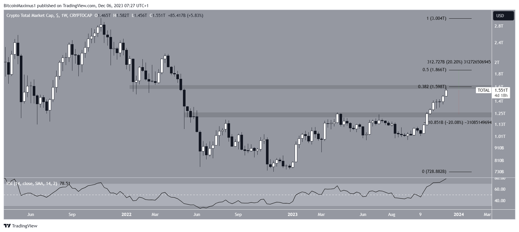 Se o TOTALCAP romper o nível mencionado acima, ele pode aumentar mais 20% e atingir a retração de 0,5 de Fibonacci em US$ 1,87 trilhão.
