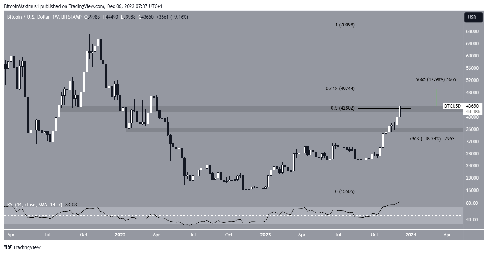 Se o BTC ultrapassar o nível de US$ 42.800, ele pode subir 13% e atingir a próxima resistência em US$ 49.250, que é criada pelo nível de retração de 0,618 de Fibonacci.
