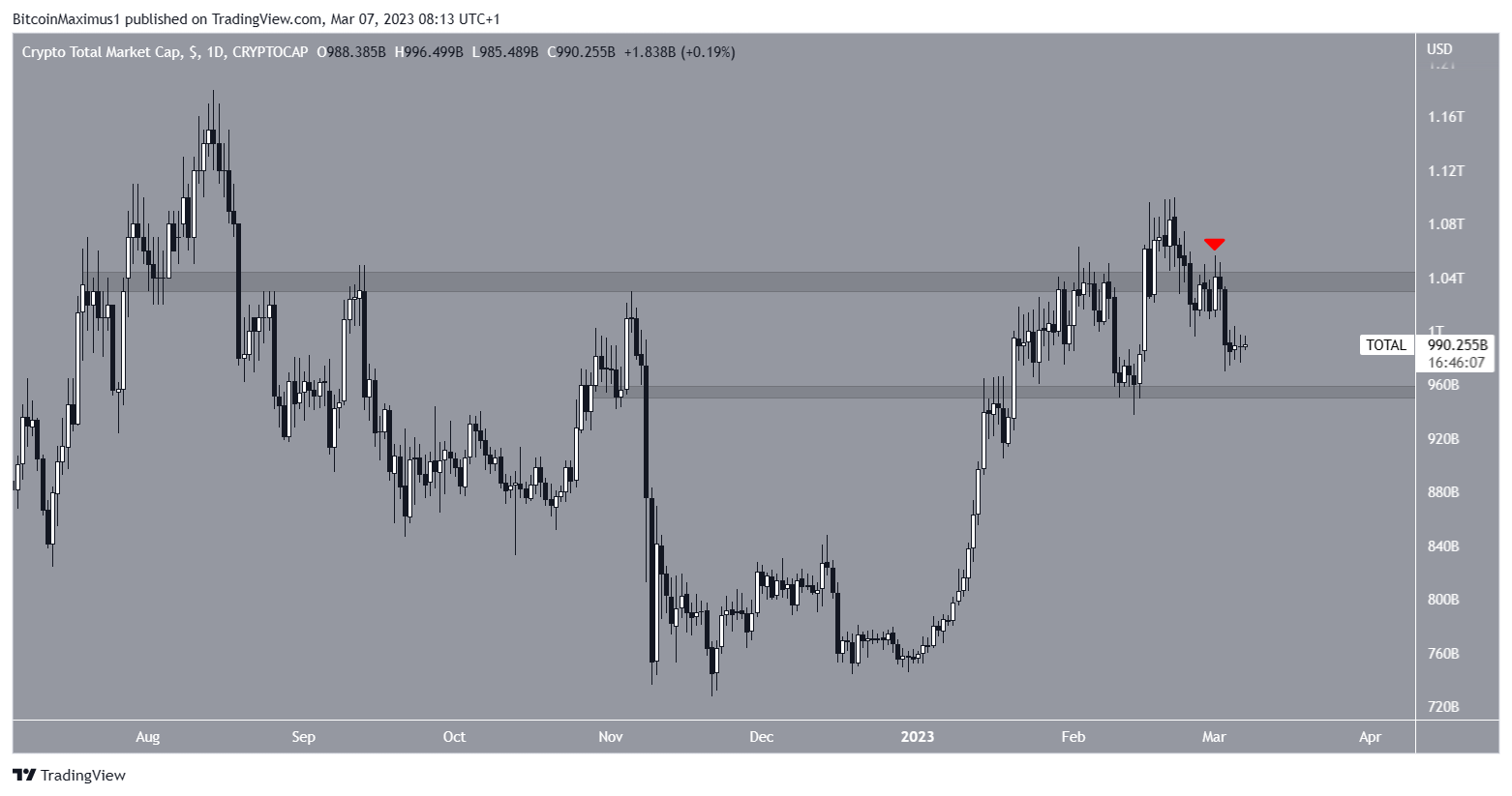O TOTALCAP está em tendência de baixa desde que foi rejeitado pela área de resistência de US$ 1,04 trilhão em 1º de março (ícone vermelho). Ele está agora próximo da área de suporte de US$ 955 bilhões.