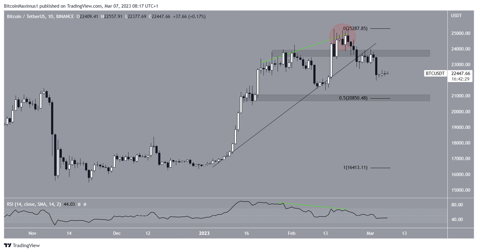 O preço do Bitcoin caiu de uma linha de tendência de alta em 24 de fevereiro. Ele a validou como resistência quatro dias depois. A queda também serviu para validar a área de resistência de US$ 23.800.