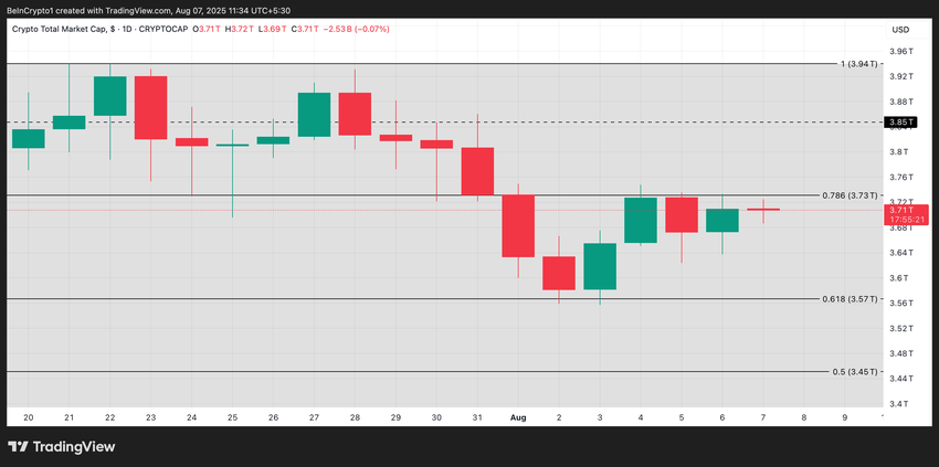 O sentimento do mercado permanece cauteloso e, a menos que surja um impulso mais forte, o TOTAL pode continuar a ser negociado lateralmente. A resistência em US$ 3,73 trilhões deve se manter firme, com suporte se formando em torno de US$ 3,57 trilhões.