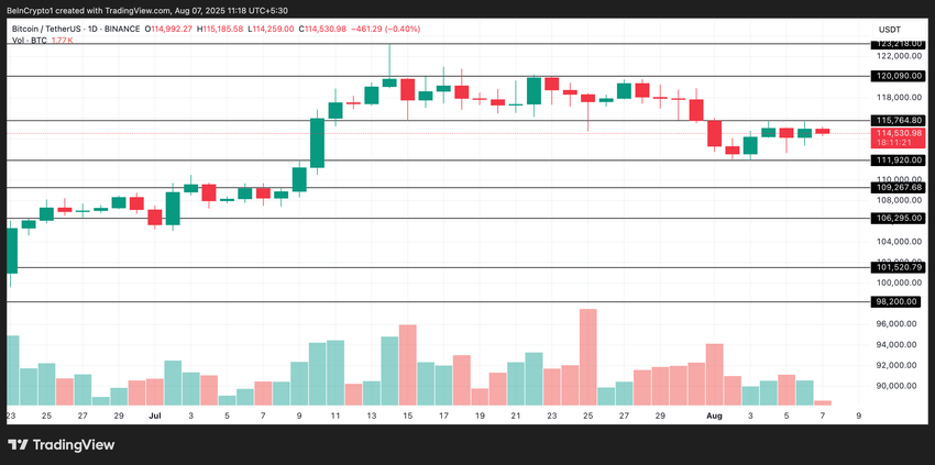 A principal moeda, o Bitcoin, está sendo negociada atualmente a US$ 114.530 , com um ganho modesto de 0,22% nas últimas 24 horas. Curiosamente, durante o mesmo período, o volume de negociação da moeda caiu 5%, totalizando US$ 56 bilhões no momento desta publicação.
