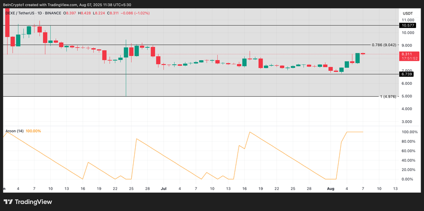 A DEXE subiu 8% nas últimas 24 horas, tornando-se a maior ganhadora do mercado. No momento da publicação, a altcoin é negociada a US$ 8,31. Ela agora está logo abaixo de um nível de resistência importante, a US$ 9,04, e pode dar outro impulso de alta se o momentum de alta se mantiver.