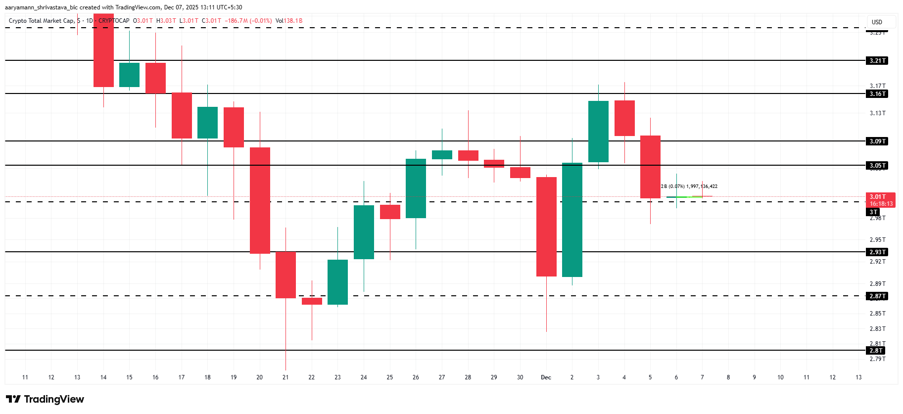 A capitalização total do mercado de criptomoedas aumentou apenas US$ 2 bilhões nas últimas 24 horas, atingindo US$ 3,01 trilhões. O ativo TOTAL permanece acima do importante nível de suporte de US$ 3,00 trilhões, que continua a ancorar a estabilidade do mercado em geral.