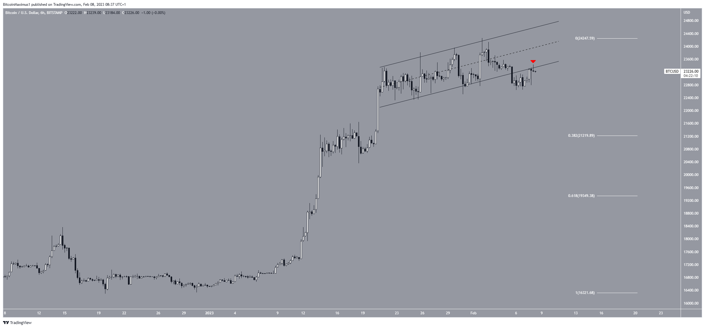 O preço do Bitcoin era negociado em um canal paralelo de alta desde 23 de janeiro. Depois de ser rejeitado por sua linha de resistência em 2 de fevereiro, o preço caiu abaixo do canal na última segunda-feira (6). Atualmente, ele está tentando validá-lo como resistência (ícone vermelho).