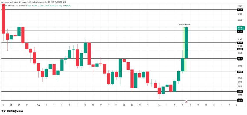 A WLD continua sendo uma das altcoins com melhor desempenho do dia, subindo quase 26% nas últimas 24 horas. O token está sendo negociado atualmente a US$ 1,21, mantendo um forte impulso que atraiu a atenção de investidores significativos no mercado de criptomoedas, à medida que os volumes continuam aumentando.